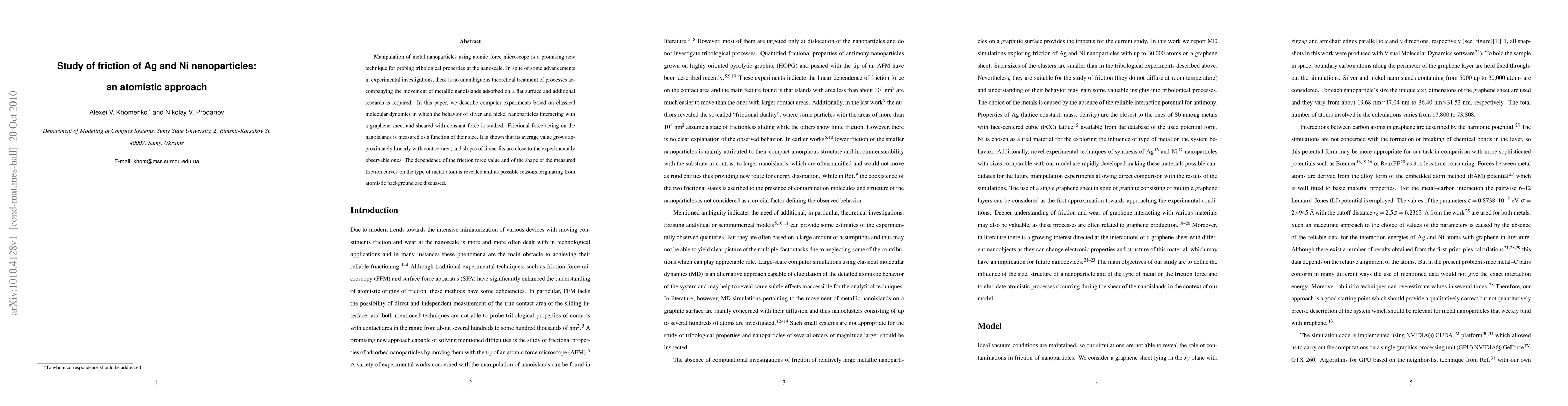 This paper uses classical molecular dynamics to investigate the friction of Ag and Ni nanoparticles interacting with a graphene sheet. The study reveals a linear relationship between the average friction force and contact area, with findings aligning with experimental observations, and highlights differences in friction behavior based on the type of metal atom.