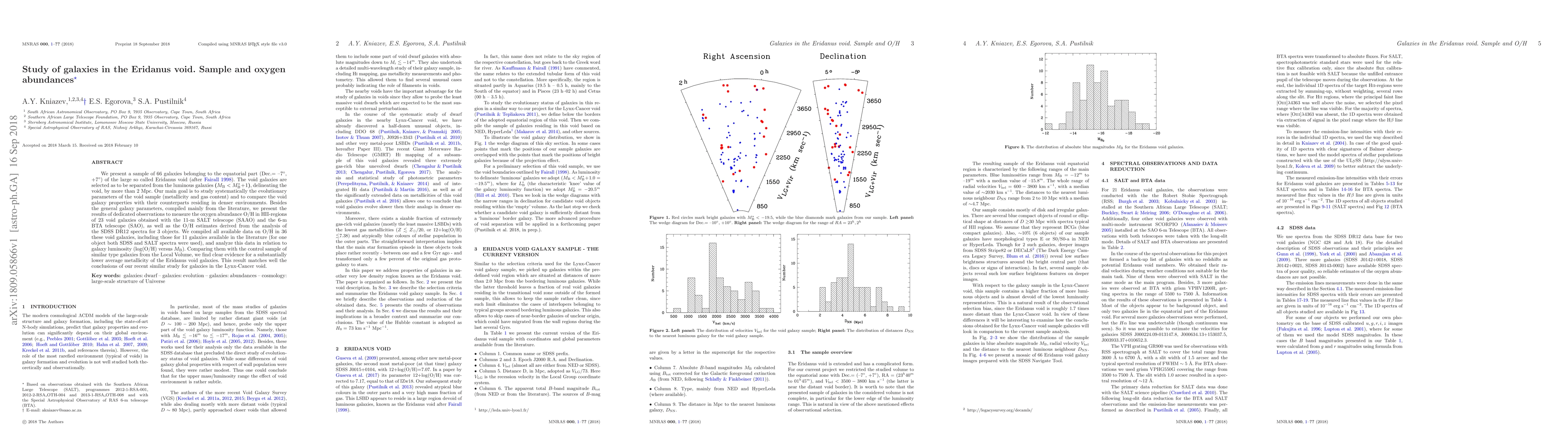 We present a sample of 66 galaxies belonging to the equatorial part (Dec.= -7$^o$, +7$^o$) of the large so called Eridanus void (after Fairall 1998). The void galaxies are selected as to be separated from the luminous galaxies ($M_{\rm B} < M_{\rm B}^{*} +1$), delineating the void, by more than 2 Mpc. Our main goal is to study systematically the evolutionary parameters of the void sample (metallicity and gas content) and to compare the void galaxy properties with their counterparts residing in denser environments. Besides the general galaxy parameters, compiled mainly from the literature, we present the results of dedicated observations to measure the oxygen abundance O/H in HII-regions of 23 void galaxies obtained with the 11-m SALT telescope (SAAO) and the 6-m BTA telescope (SAO), as well as the O/H estimates derived from the analysis of the SDSS DR12 spectra for 3 objects. We compiled all available data on O/H in 36 these void galaxies, including those for 11 galaxies available in the literature (for one object both SDSS and SALT spectra were used), and analyze this data in relation to galaxy luminosity ($\log$(O/H) versus $M_{\rm B}$). Comparing them with the control sample of similar type galaxies from the Local Volume, we find clear evidence for a substantially lower average metallicity of the Eridanus void galaxies. This result matches well the conclusions of our recent similar study for galaxies in the Lynx-Cancer void.