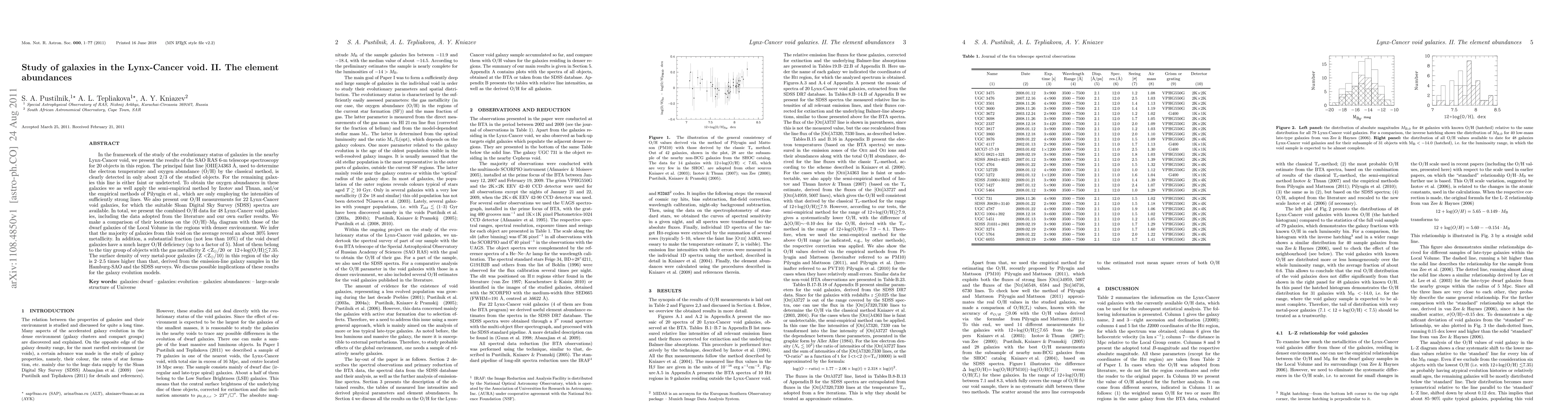 This paper investigates the element abundances of galaxies in the Lynx-Cancer void using spectroscopic data, revealing that most galaxies exhibit lower metallicity by about 30% compared to denser regions. A significant fraction of these void galaxies show even more extreme metal deficiencies, up to a factor of 5, suggesting unique implications for galaxy evolution models.