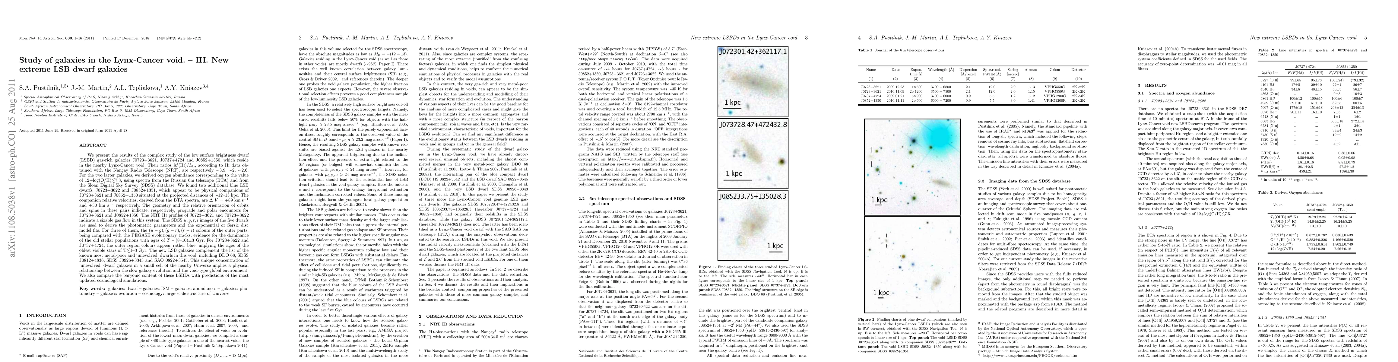 (Abridged) We present the results of the complex study of the low surface brightness dwarf (LSBD) gas-rich galaxies J0723+3621, J0737+4724 and J0852+1350, which reside in the nearby Lynx-Cancer void. Their ratios M(HI)/L_B, according to HI data obtained with the NRT, are respectively ~3.9, ~2, ~2.6. For the two latter galaxies, we derived oxygen abundance corresponding to the value of 12+log(O/H) <~7.3, using spectra from the Russian 6m telescope and from the SDSS database. We found two additional blue LSB dwarfs, J0723+3622 and J0852+1351, which appear to be physical companions of J0723+3621 and J0852+1350 situated at the projected distances of ~12--13 kpc. The companion relative velocities, derived from the BTA spectra, are dV = +89 km/s and +30 km/s respectively. The geometry and the relative orientation of orbits and spins in these pairs indicate, respectively, prograde and polar encounters for J0723+3621 and J0852+1350. The NRT HI profiles of J0723+3621 and J0723+3622 indicate a sizable gas flow in this system. The SDSS u,g,r,i images of the five dwarfs are used to derive the photometric parameters and the exponential or Sersic disc model fits. For three of them, the (u-g),(g-r),(r-i) colours of the outer parts, being compared with the PEGASE evolutionary tracks, evidence for the dominance of the old stellar populations with ages of T ~(8-10)+-3 Gyr. For J0723+3622 and J0737+4724, the outer region colours appear rather blue, implying the ages of the oldest visible stars of T <~1-3 Gyr. The new LSB galaxies complement the list of the known most metal-poor and `unevolved' dwarfs in this void, including DDO 68, SDSS J0926+3343 and others. This unique concentration of 'unevolved' dwarf galaxies in a small cell of the nearby Universe implies a physical relationship between the slow galaxy evolution and the void-type global environment.
