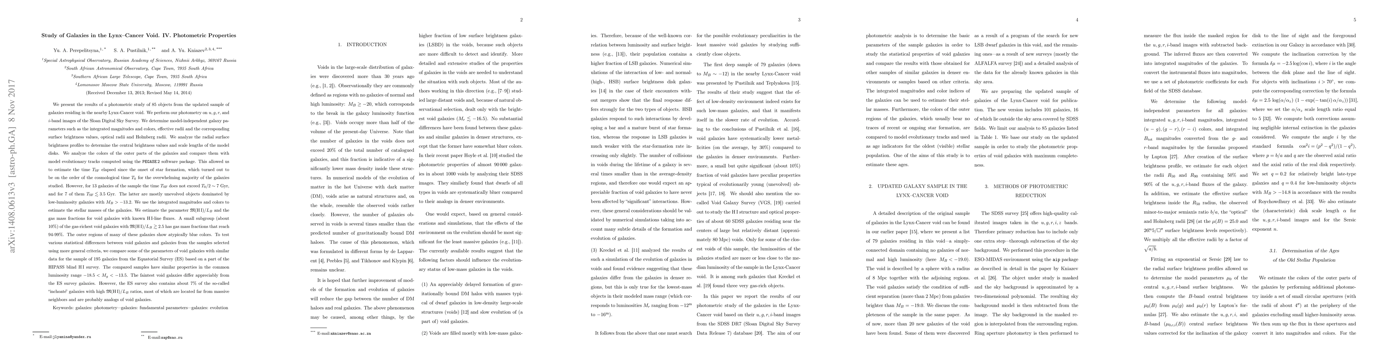 We present the results of a photometric study of 85 objects from the updated sample of galaxies residing in the nearby Lynx--Cancer void. We perform our photometry on u, g, r, and i-band images of the Sloan Digital Sky Survey. We determine model-independent galaxy parameters such as the integrated magnitudes and colors, effective radii and the corresponding surface brightness values, optical radii and Holmberg radii. We analyze the radial surface brightness profiles to determine the central brightness values and scale lengths of the model discs. We analyze the colors of the outer parts of the galaxies and compare them with model evolutionary tracks computed using the PEGASE2 software package. This allowed us to estimate the time T_SF elapsed since the onset of star formation, which turned out to be on the order of the cosmological time T_0 for the overwhelming majority of the galaxies studied. However, for 13 galaxies of the sample the time T_SF does not exceed T_0/2 ~ 7 Gyr, and for 7 of them T_SF < 3.5 Gyr. The latter are mostly unevolved objects dominated by low-luminosity galaxies with M_B > -13.2. We use the integrated magnitudes and colors to estimate the stellar masses of the galaxies. We estimate the parameter M(HI)/L_B and the gas mass fractions for void galaxies with known HI-line fluxes. A small subgroup (about 10%) of the gas-richest void galaxies with M(HI)/L_B > 2.5 has gas mass fractions that reach 94-99%. The outer regions of many of these galaxies show atypically blue colors. To test various statistical differences between void galaxies and galaxies from the samples selected using more general criteria, we compare some of the parameters of void galaxies with similar data for the sample of 195 galaxies from the Equatorial Survey (ES) based on a part of the HIPASS blind HI survey. abridged
