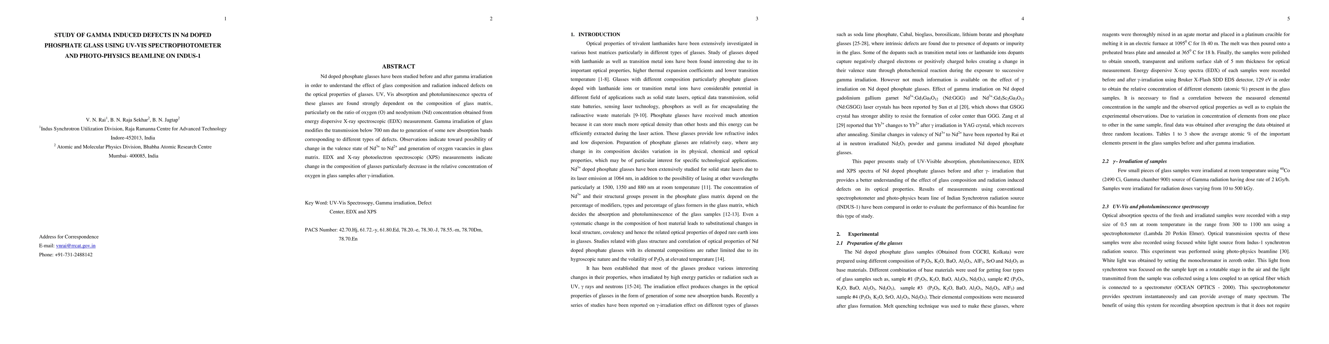 This study investigates the impact of gamma irradiation on Nd doped phosphate glass using UV-Vis spectroscopy and photophysics beamline analysis. Findings reveal that gamma irradiation induces new absorption bands and modifies the optical properties, suggesting changes in the valence state of Nd and the generation of oxygen vacancies.