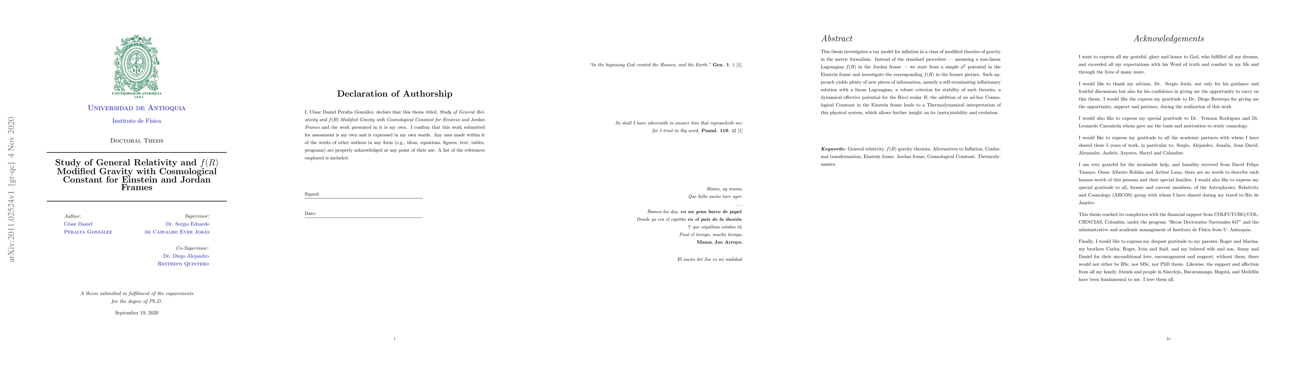This thesis investigates a toy model for inflation in a class of modified theories of gravity in the metric formalism. Instead of the standard procedure -- assuming a non-linear Lagrangian $f(R)$ in the Jordan frame -- we start from a simple {\phi}^2 potential in the Einstein frame and investigate the corresponding $f(R)$ in the former picture. Such approach yields plenty of new pieces of information, namely a self-terminating inflationary solution with a linear Lagrangian, a robust criterion for stability of such theories, a dynamical effective potential for the Ricci scalar $R$, the addition of an ad-hoc Cosmological Constant in the Einstein frame leads to a Thermodynamical interpretation of this physical system, which allows further insight on its (meta)stability and evolution.