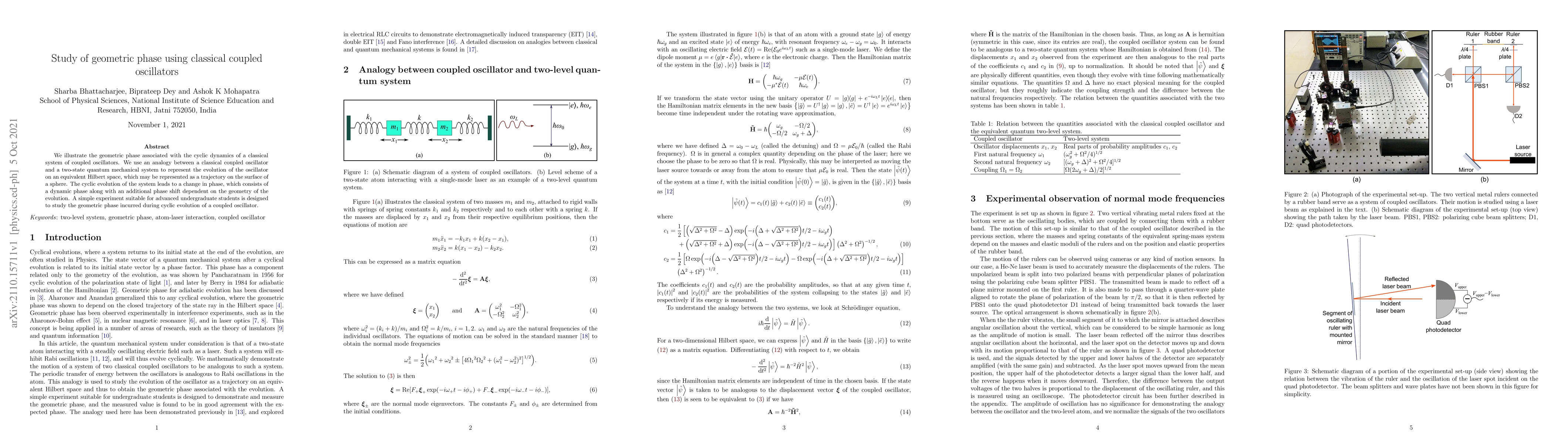 We illustrate the geometric phase associated with the cyclic dynamics of a classical system of coupled oscillators. We use an analogy between a classical coupled oscillator and a two-state quantum mechanical system to represent the evolution of the oscillator on an equivalent Hilbert space, which may be represented as a trajectory on the surface of a sphere. The cyclic evolution of the system leads to a change in phase, which consists of a dynamic phase along with an additional phase shift dependent on the geometry of the evolution. A simple experiment suitable for advanced undergraduate students is designed to study the geometric phase incurred during cyclic evolution of a coupled oscillator.