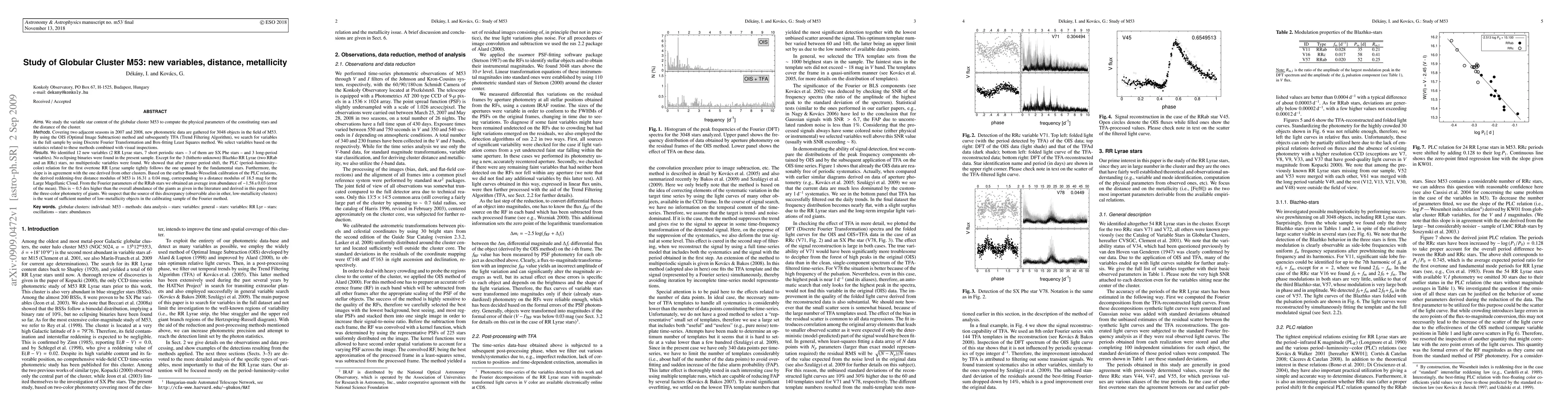 We study the variable star content of the globular cluster M53 to compute the physical parameters of the constituting stars and the distance of the cluster. Covering two adjacent seasons in 2007 and 2008, new photometric data are gathered for 3048 objects in the field of M53. By using the OIS method and subsequently TFA, we search for variables in the full sample by using DFT and BLS methods. We select variables based on the statistics related to these methods combined with visual inspections. We identified 12 new variables (2 RR Lyrae stars, 7 short periodic stars - 3 of them are SX Phe stars - and 3 long-period variables). No eclipsing binaries were found in the present sample. Except for the 3 (hitherto unknown) Blazhko RR Lyrae stars, no multiperiodic variables were found. We showed that after proper period shift, the PLC relation for the first overtone RR Lyrae sample tightly follows the one spanned by the fundamental stars. Furthermore, the slope is in agreement with the one derived from other clusters. Based on the earlier Baade-Wesselink calibration of the PLC relations, the derived reddening-free distance modulus of M53 is 16.31 +/- 0.04 mag, corresponding to a distance modulus of 18.5 mag for the Large Magellanic Cloud. From the Fourier parameters of the RRab stars we obtained an average iron abundance of -1.58 +/- 0.03. This is ~0.5 dex higher than the overall abundance of the giants as given in the literature and derived in this paper from the three-color photometry of giants. We suspect that the source of this discrepancy (observable also in other, low-metallicity clusters) is the want of sufficient number of low-metallicity objects in the calibrating sample of the Fourier method.
