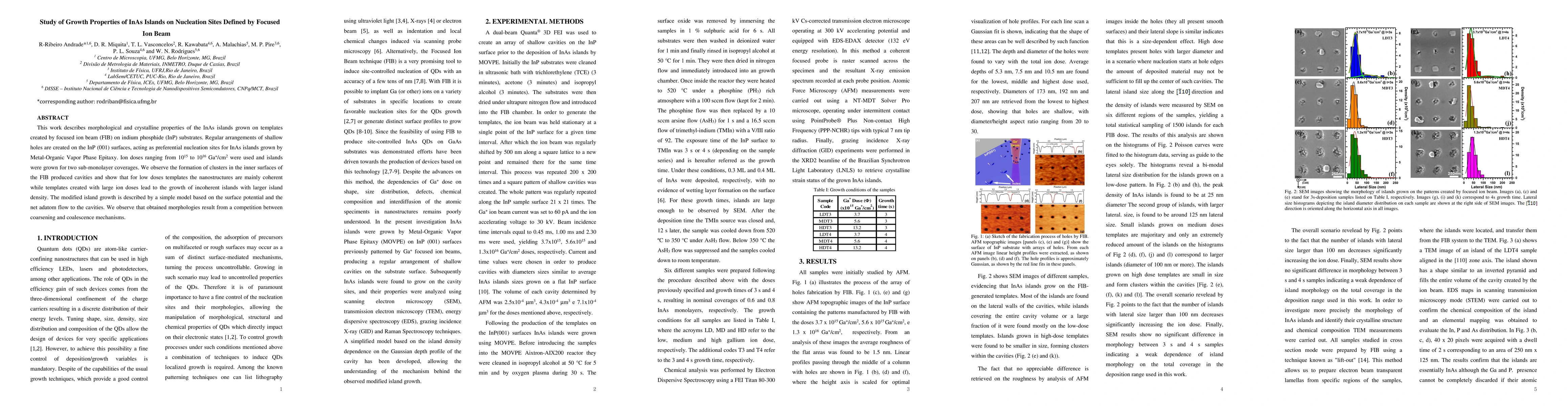This study investigates the growth properties of InAs islands on FIB-defined nucleation sites on InP substrates, revealing that low ion doses produce coherent nanostructures while high doses lead to incoherent islands with increased density, attributed to a balance between coarsening and coalescence mechanisms.