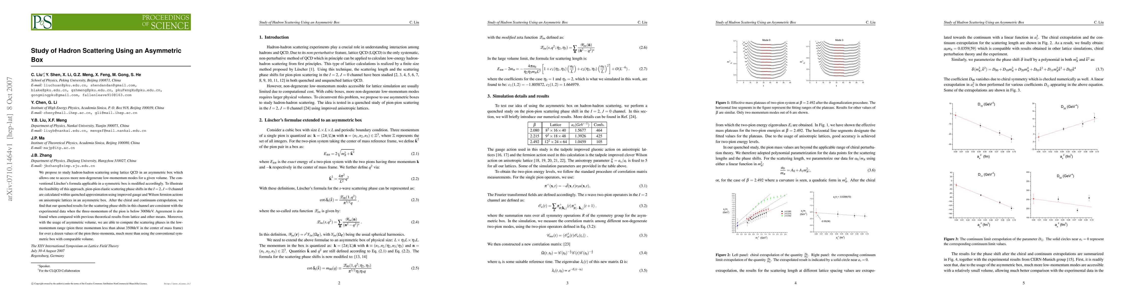 We propose to study hadron-hadron scattering using lattice QCD in an asymmetric box which allows one to access more non-degenerate low-momentum modes for a given volume. The conventional L\"{u}scher's formula applicable in a symmetric box is modified accordingly. To illustrate the feasibility of this approach, pion-pion elastic scattering phase shifts in the I=2, J=0 channel are calculated within quenched approximation using improved gauge and Wilson fermion actions on anisotropic lattices in an asymmetric box. After the chiral and continuum extrapolation, we find that our quenched results for the scattering phase shifts in this channel are consistent with the experimental data when the three-momentum of the pion is below 300MeV. Agreement is also found when compared with previous theoretical results from lattice and other means. Moreover, with the usage of asymmetric volume, we are able to compute the scattering phases in the low-momentum range (pion three momentum less than about 350MeV in the center of mass frame) for over a dozen values of the pion three-momenta, much more than using the conventional symmetric box with comparable volume.
