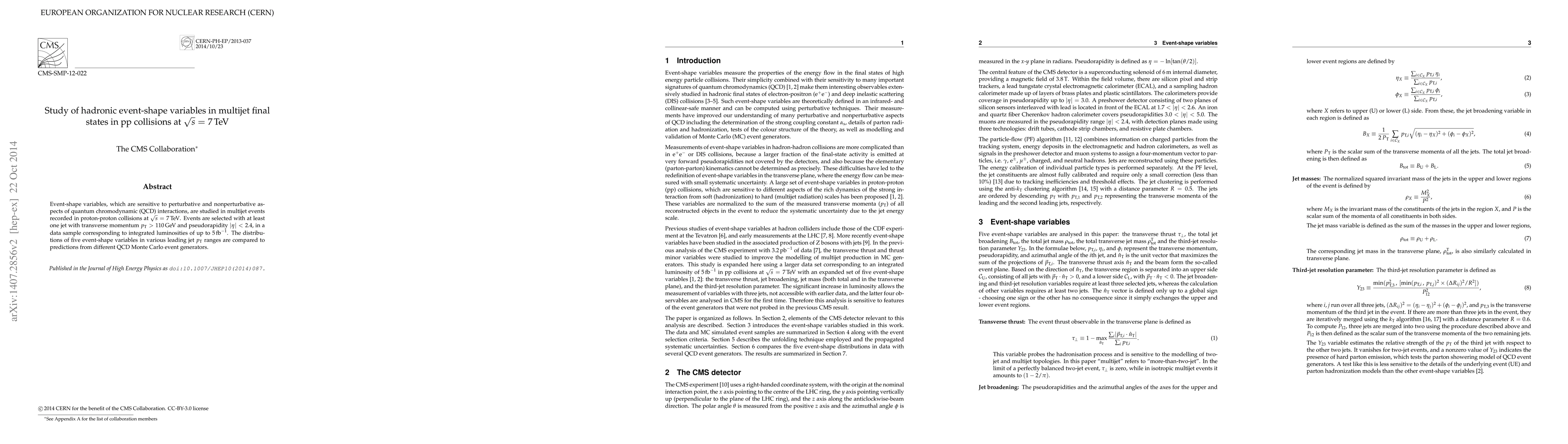 This paper investigates event-shape variables in multijet events from proton-proton collisions at 7 TeV, focusing on their sensitivity to QCD interactions. The study compares the distributions of these variables against predictions from various QCD Monte Carlo models.