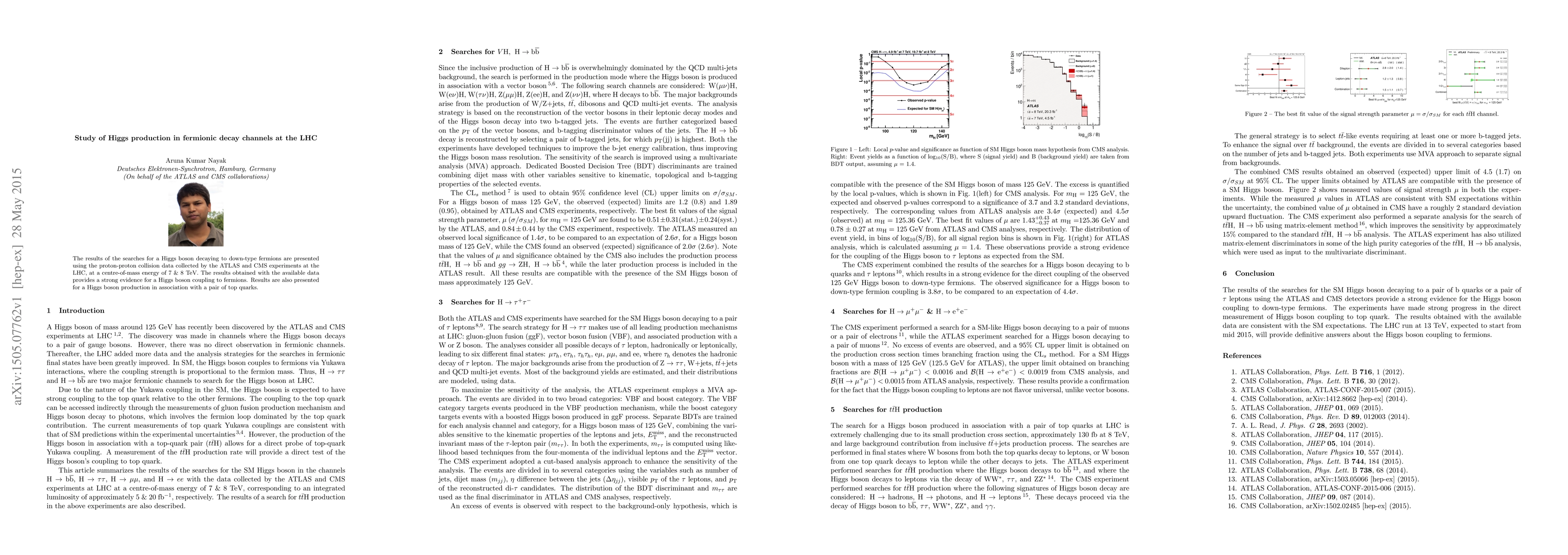 The study, using data from ATLAS and CMS experiments at LHC, presents evidence for Higgs boson decay into down-type fermions, confirming its coupling with fermions. Additionally, results on Higgs boson production in association with top quark pairs are reported.