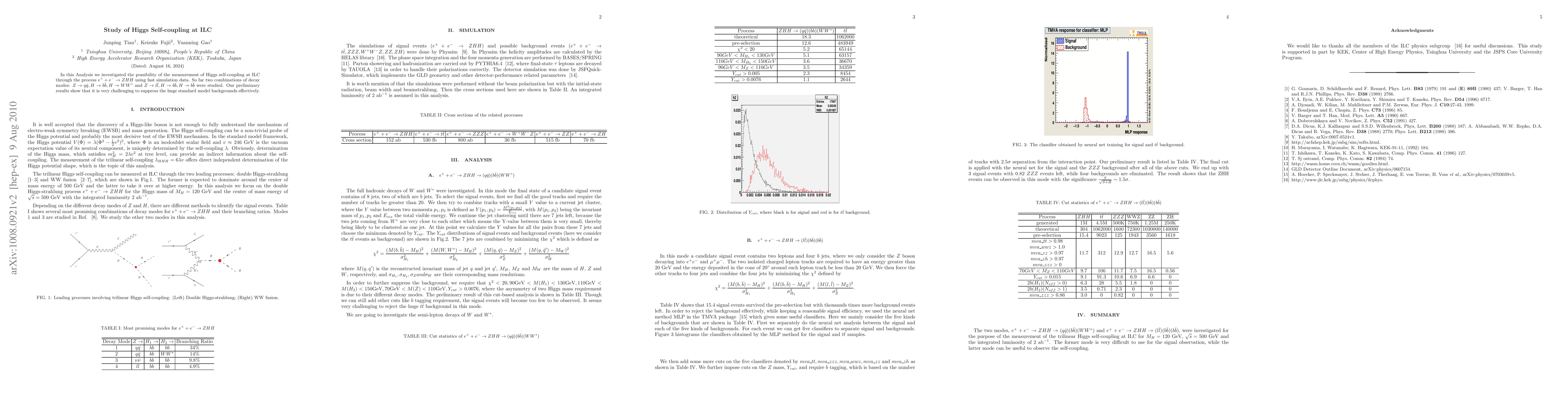 In this Analysis we investigated the possibility of the measurement of Higgs self-coupling at ILC through the process $e^++e^-\rightarrow ZHH$ using fast simulation data. So far two combinations of decay modes: $Z\rightarrow q \bar q,H\rightarrow b\bar b, H\rightarrow WW^*$ and $Z\rightarrow l \bar l, H\rightarrow b\bar b, H\rightarrow b\bar b$ were studied. Our preliminary results show that it is very challenging to suppress the huge standard model backgrounds effectively.