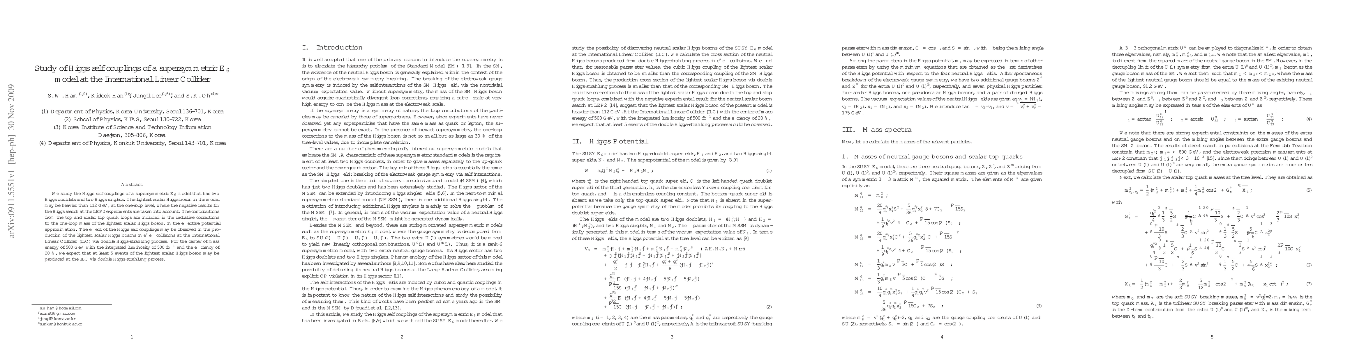 This paper investigates the Higgs self-couplings in a supersymmetric $E_6$ model featuring two Higgs doublets and two singlets, considering top and scalar top contributions. The study predicts the lightest scalar Higgs may exceed 112 GeV, with potential observation at the International Linear Collider via the double Higgs-strahlung process, expecting at least 5 events at 500 GeV and 500 fb$^{-1}$.