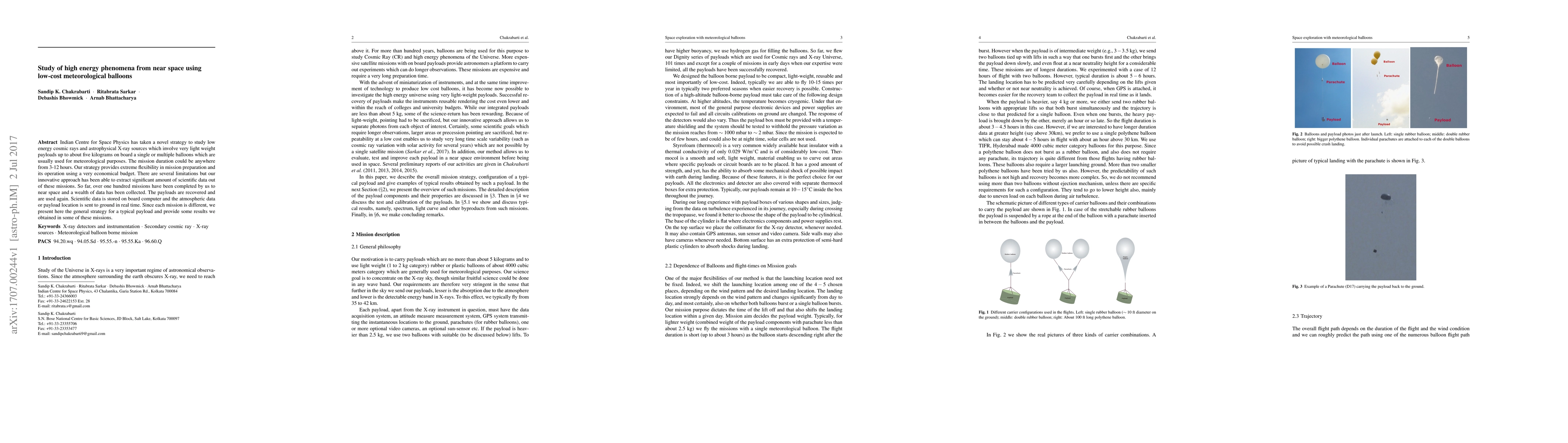 Indian Centre for Space Physics has taken a novel strategy to study low energy cosmic rays and astrophysical X-ray sources which involve very light weight payloads up to about five kilograms on board a single or multiple balloons which are usually used for meteorological purposes. The mission duration could be anywhere from 3-12 hours. Our strategy provides extreme flexibility in mission preparation and its operation using a very economical budget. There are several limitations but our innovative approach has been able to extract significant amount of scientific data out of these missions. So far, over one hundred missions have been completed by us to near space and a wealth of data has been collected. The payloads are recovered and are used again. Scientific data is stored on board computer and the atmospheric data or payload location is sent to ground in real time. Since each mission is different, we present here the general strategy for a typical payload and provide some results we obtained in some of these missions.