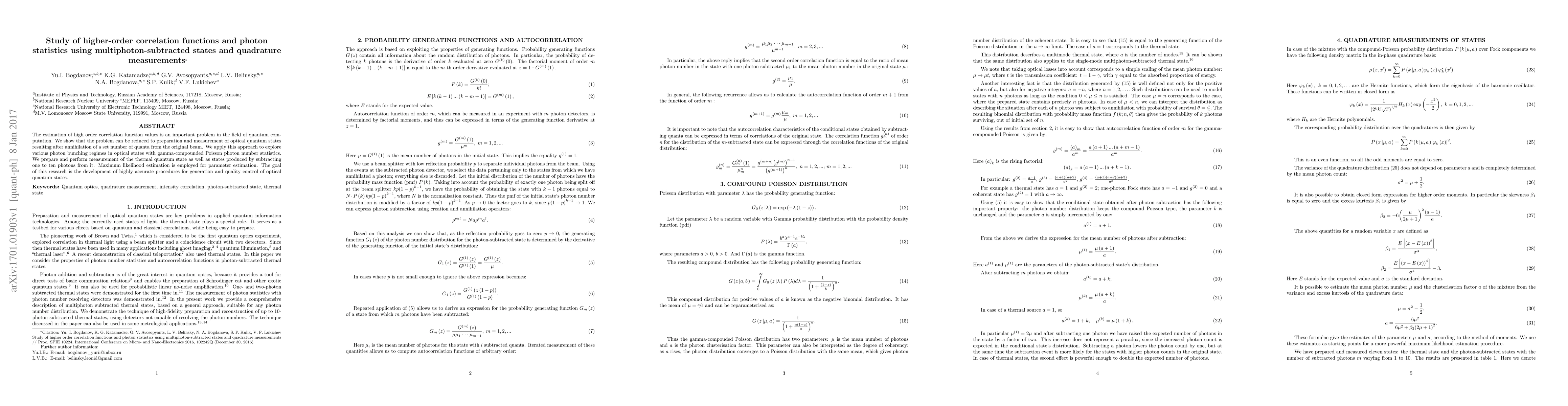 The estimation of high order correlation function values is an important problem in the field of quantum computation. We show that the problem can be reduced to preparation and measurement of optical quantum states resulting after annihilation of a set number of quanta from the original beam. We apply this approach to explore various photon bunching regimes in optical states with gamma-compounded Poisson photon number statistics. We prepare and perform measurement of the thermal quantum state as well as states produced by subtracting one to ten photons from it. Maximum likelihood estimation is employed for parameter estimation. The goal of this research is the development of highly accurate procedures for generation and quality control of optical quantum states.