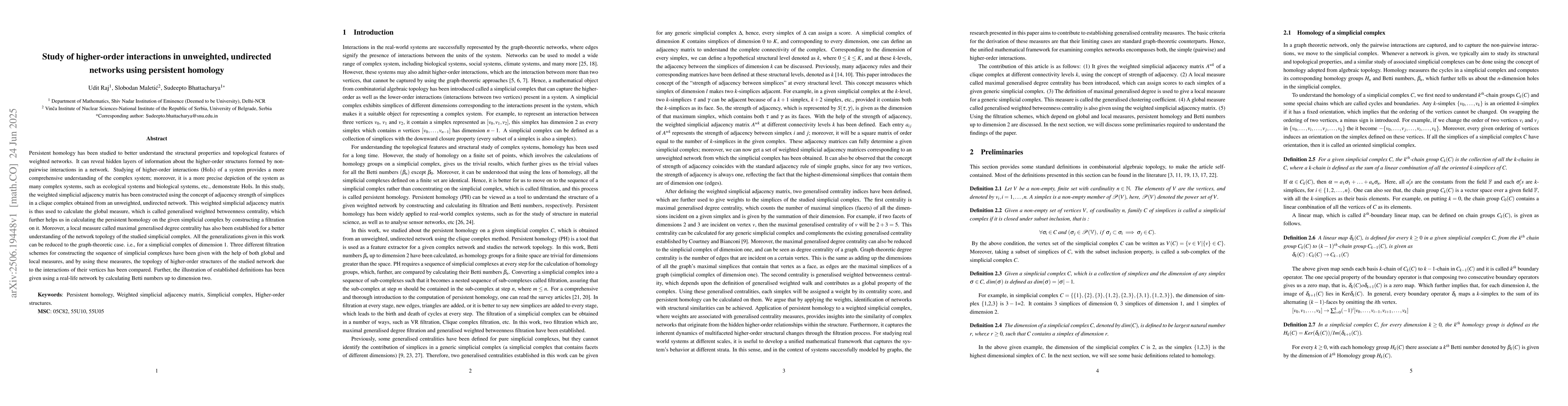 Persistent homology has been studied to better understand the structural properties and topology features of weighted networks. It can reveal hidden layers of information about the higher-order structures formed by non-pairwise interactions in a network. Studying of higher-order interactions (HoIs) of a system provides a more comprehensive understanding of the complex system; moreover, it is a more precise depiction of the system as many complex systems, such as ecological systems and biological systems, etc., demonstrate HoIs. In this study, the weighted simplicial adjacency matrix has been constructed using the concept of adjacency strength of simplices in a clique complex obtained from an unweighted, undirected network. This weighted simplicial adjacency matrix is thus used to calculate the global measure, which is called generalised weighted betweenness centrality, which further helps us in calculating the persistent homology on the given simplicial complex by constructing a filtration on it. Moreover, a local measure called maximal generalised degree centrality has also been established for better understanding of the network topology of the studied simplicial complex. All the generalizations given in this work can be reduced to the graph-theoretic case. i.e., for a simplicial complex of dimension 1. Three different filtration schemes for constructing the sequence of simplicial complexes have been given with the help of both global and local measures, and by using these measures, the topology of higher-order structures of the studied network due to the interactions of their vertices has been compared. Further, the illustration of established definitions has been given using a real-life network by calculating Betti numbers up to dimension two.