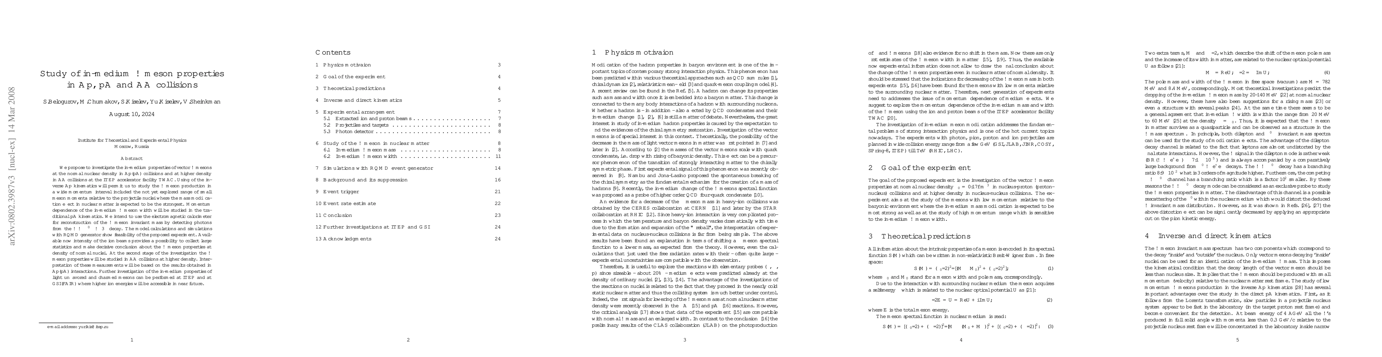 We propose to investigate the in-medium properties of vector $\omega$ mesons at the normal nuclear density in Ap(pA) collisions and at higher density in AA collisions at the ITEP accelerator facility TWAC. Using of the inverse Ap kinematics will permit us to study the $\omega$ meson production in a wide momentum interval included the not yet explored range of small meson momenta relative to the projectile nuclei where the mass modification effect in nuclear matter is expected to be the strongest. Momentum dependence of the in-medium $\omega$ meson width will be studied in the traditional pA kinematics. We intend to use the electromagnetic calorimeter for reconstruction of the $\omega$ meson invariant mass by detecting photons from the $\omega \to \pi^{0}\gamma \to 3\gamma$ decay. The model calculations and simulations with RQMD generator show feasibility of the proposed experiment. Available now intensity of the ion beams provides a possibility to collect large statistics and make decisive conclusion about the $\omega$ meson properties at density of normal nuclei. At the second stage of the investigation the $\omega$ meson properties will be studied in AA collisions at higher density. Interpretation of these measurements will be based on the results obtained in Ap(pA) interactions. Further investigation of the in-medium properties of light unflavored and charmed mesons can be performed at ITEP and at GSI(FAIR) where higher ion energies will be accessible in near future.