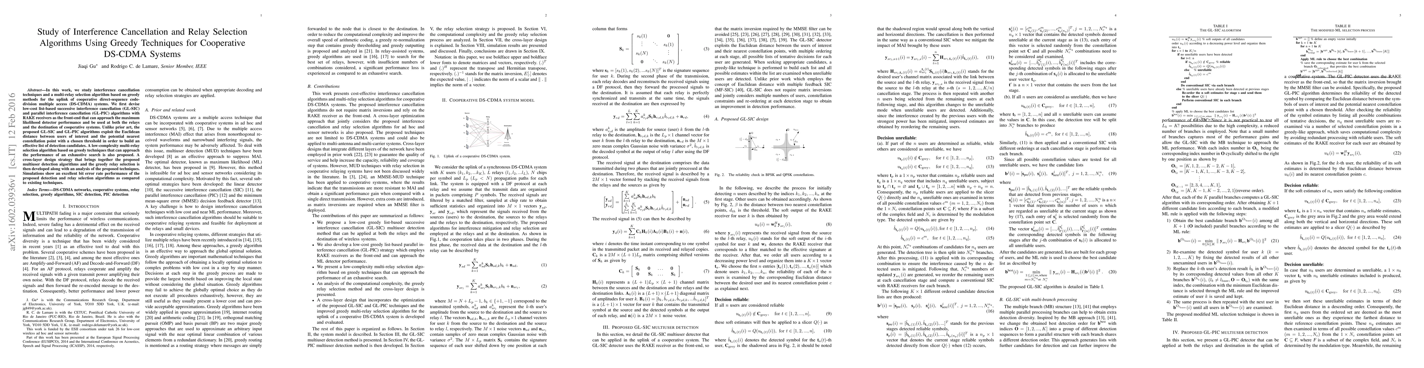 This paper proposes low-cost interference cancellation algorithms (GL-SIC and GL-PIC) and a multi-relay selection method based on greedy techniques for cooperative DS-CDMA systems, achieving near-optimal performance with reduced complexity compared to exhaustive search methods. Simulation results demonstrate superior bit error rate performance.