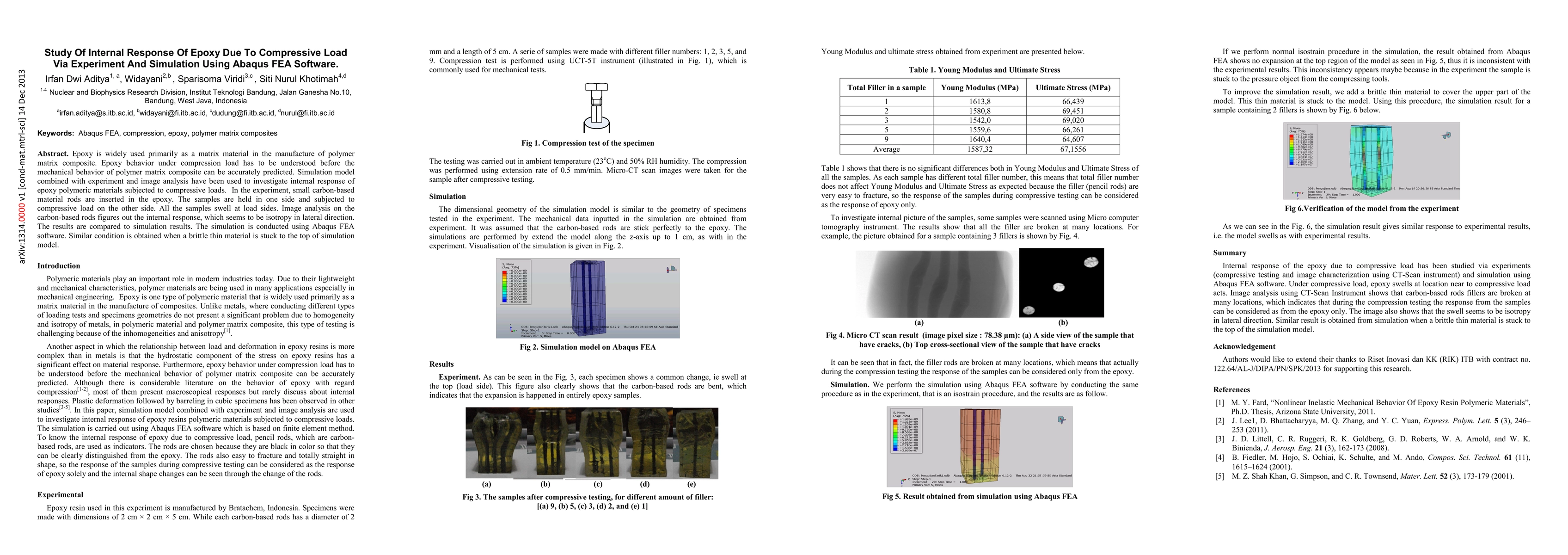Epoxy is widely used primarily as a matrix material in the manufacture of polymer matrix composite. Epoxy behavior under compression load has to be understood before the mechanical behavior of polymer matrix composite can be accurately predicted. Simulation model combined with experiment and image analysis have been used to investigate internal response of epoxy polymeric materials subjected to compressive loads. In the experiment, small carbon-based material rods are inserted in the epoxy. The samples are held in one side and subjected to compressive load on the other side. All the samples swell at load sides. Image analysis on the carbon-based rods figures out the internal response, which seems to be isotropy in lateral direction. The results are compared to simulation results. The simulation is conducted using Abaqus FEA software. Similar condition is obtained when a brittle thin material is stuck to the top of simulation model. Keywords: Abaqus FEA, compression, epoxy, polymer matrix composites