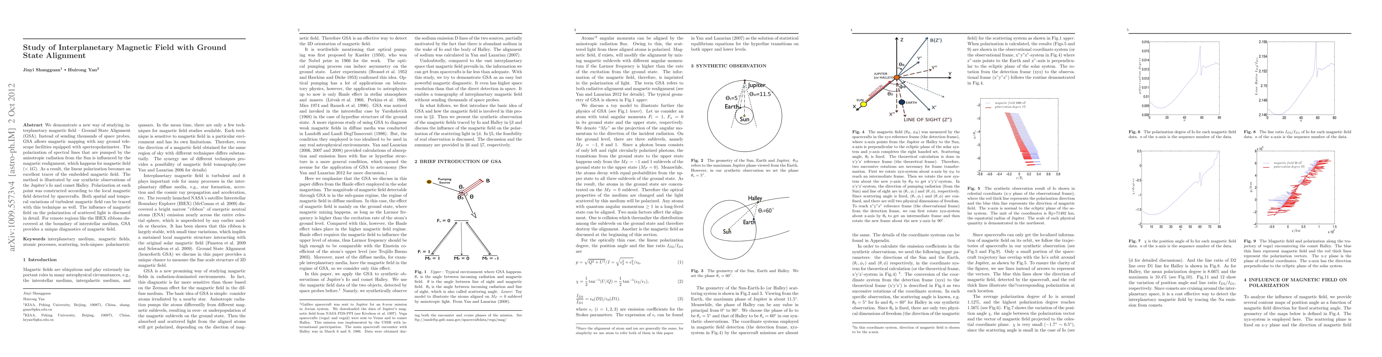 We demonstrate a new way of studying interplanetary magnetic field -- Ground State Alignment (GSA). Instead of sending thousands of space probes, GSA allows magnetic mapping with any ground telescope facilities equipped with spectropolarimeter. The polarization of spectral lines that are pumped by the anisotropic radiation from the Sun is influenced by the magnetic realignment, which happens for magnetic field (<1G). As a result, the linear polarization becomes an excellent tracer of the embedded magnetic field. The method is illustrated by our synthetic observations of the Jupiter's Io and comet Halley. Polarization at each point was constructed according to the local magnetic field detected by spacecrafts. Both spatial and temporal variations of turbulent magnetic field can be traced with this technique as well. The influence of magnetic field on the polarization of scattered light is discussed in detail. For remote regions like the IBEX ribbons discovered at the boundary of interstellar medium, GSA provides a unique diagnostics of magnetic field.