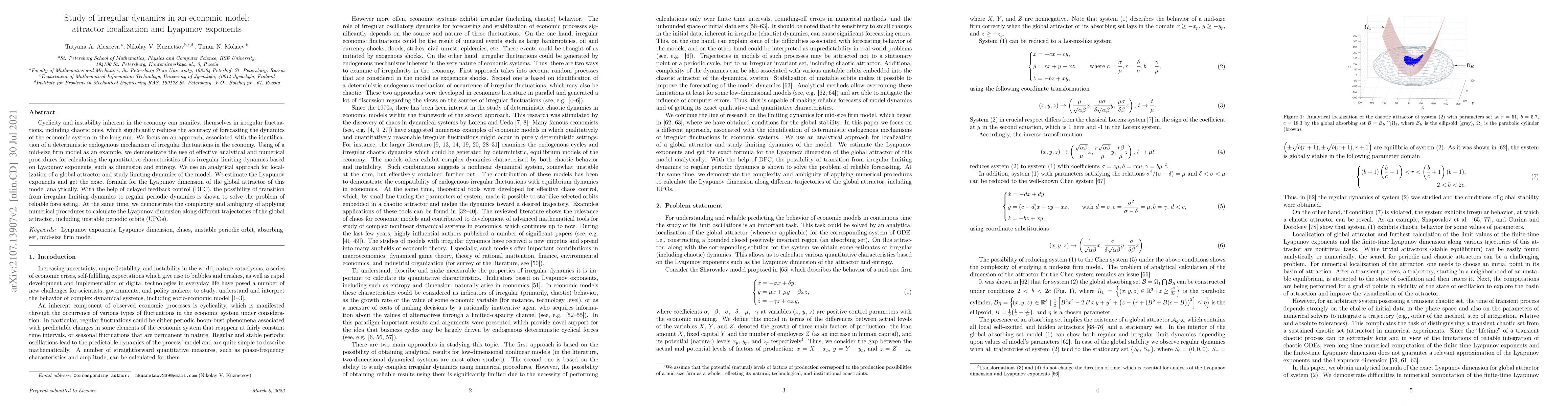 This paper investigates irregular dynamics in an economic model using Lyapunov exponents to quantify chaotic behavior. It demonstrates analytical and numerical methods to identify the global attractor and its dimension, and shows how delayed feedback control can transition irregular dynamics to regular periodic behavior for improved forecasting.