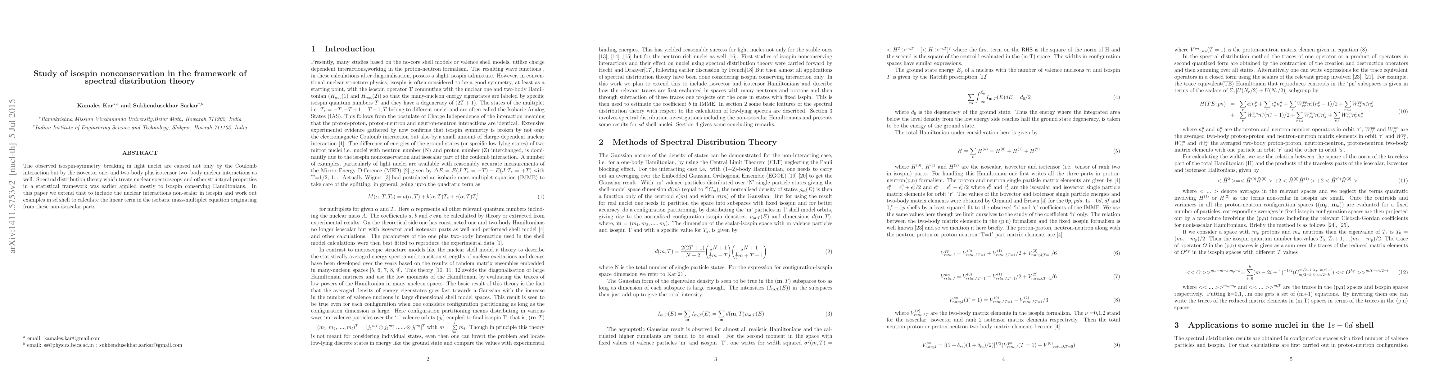 This research extends spectral distribution theory to include non-scalar isospin nuclear interactions, demonstrating their impact on isospin symmetry breaking in light nuclei of the sd shell. It calculates the linear term in the isobaric mass-multiplet equation arising from these non-scalar parts.