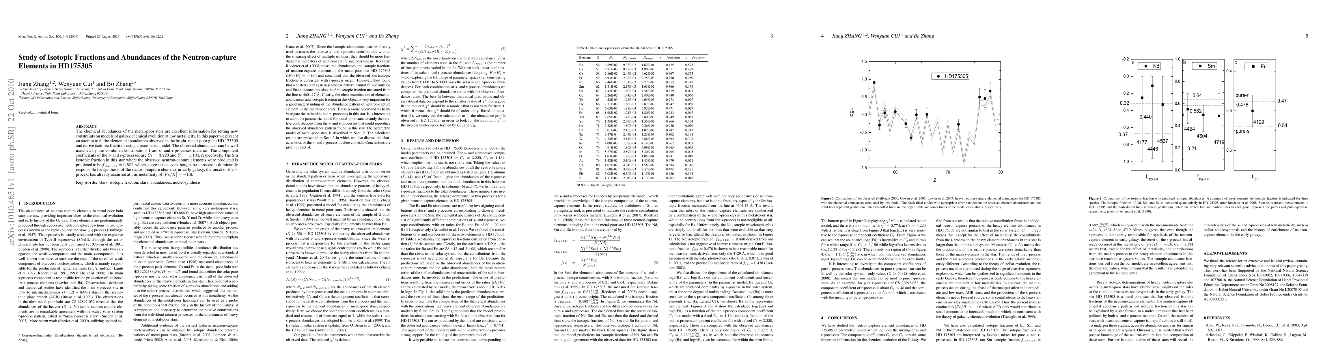 The chemical abundances of metal-poor stars are excellent sources of information for setting new constraints on models of Galactic chemical evolution at low metallicities. In this paper we present an attempt to fit the elemental abundances observed in the bright, metal-poor giant HD 175305, and derive isotopic fractions using a parametric model. The observed abundances can be wellmatched by the combined contributions froms- and r-processmaterial. The component coefficients of the r- and s-processes are C1 = 3.220 and C3 = 1.134, respectively. The Smisotopic fraction in this star where the observed neutron-capture elements are produced is predicted to be f 152+154 =0.582,which suggests that, even though the r-process is predominantly responsible for the synthesis of the neutron-capture elements in the early Galaxy, the onset of the s-process had already occurred at this metallicity of [Fe/H] = -1.6.