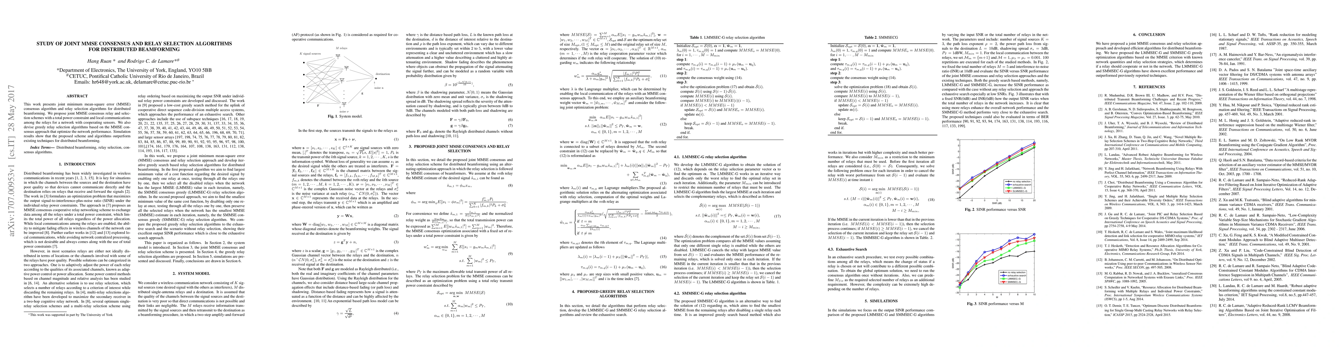 This paper proposes joint MMSE consensus and relay selection algorithms for distributed beamforming, optimizing network performance under power constraints. Simulation results demonstrate superior performance over existing techniques.