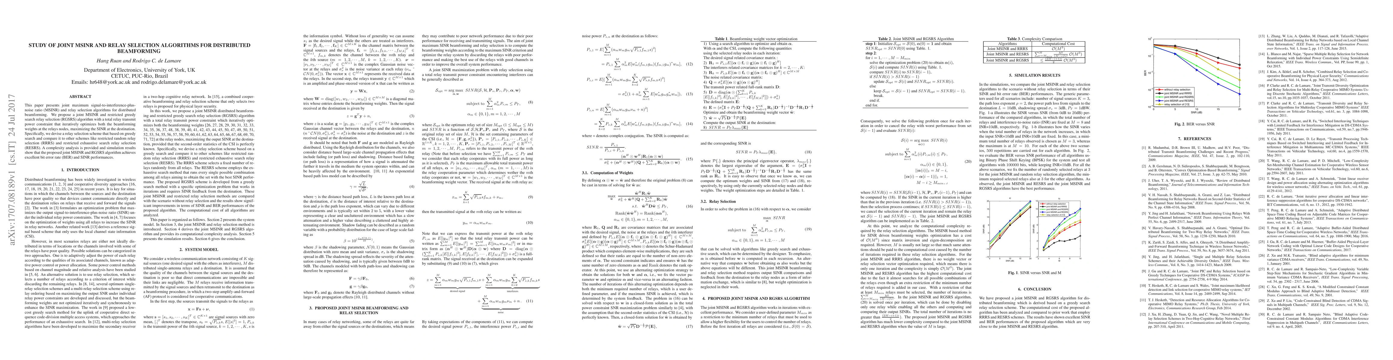 This paper proposes joint maximum signal-to-interference-plus-noise ratio (MSINR) and relay selection algorithms for distributed beamforming, introducing an iterative algorithm that optimizes beamforming weights and relay selection under a power constraint. Simulation results demonstrate superior bit error rate (BER) and SINR performance compared to alternative relay selection schemes.