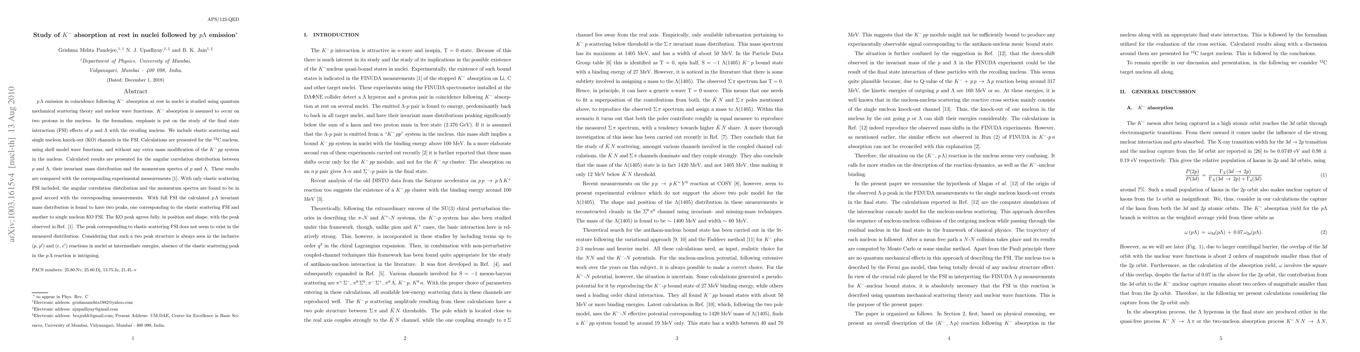 $p\,\Lambda$ emission in coincidence following $K^-$ absorption at rest in nuclei is studied using quantum mechanical scattering theory and nuclear wave functions. $K^-$ absorption is assumed to occur on two protons in the nucleus. In the formalism, emphasis is put on the study of the final state interaction (FSI) effects of $p$ and $\Lambda$ with the recoiling nucleus. We include elastic scattering and single nucleon knock-out (KO) channels in the FSI. Calculations are presented for the $^{12}$C nucleus, using shell model wave functions, and without any extra mass modification of the $K^-\,pp$ system in the nucleus. Calculated results are presented for the angular correlation distribution between $p$ and $\Lambda$, their invariant mass distribution and the momentum spectra of $p$ and $\Lambda$. These results are compared with the corresponding experimental measurements \cite{agnello}. With only elastic scattering FSI included, the angular correlation distribution and the momentum spectra are found to be in good accord with the corresponding measurements. With full FSI the calculated $p\,\Lambda$ invariant mass distribution is found to have two peaks, one corresponding to the elastic scattering FSI and another to single nucleon KO FSI. The KO peak agrees fully, in position and shape, with the peak observed in Ref. \cite{agnello}. The peak corresponding to elastic scattering FSI does not seem to exist in the measured distribution. Considering that such a two peak structure is always seen in the inclusive ($p$, $p^\prime $) and ($e$, $e^\prime $) reactions in nuclei at intermediate energies, absence of the elastic scattering peak in the $p\,\Lambda$ reaction is intriguing.