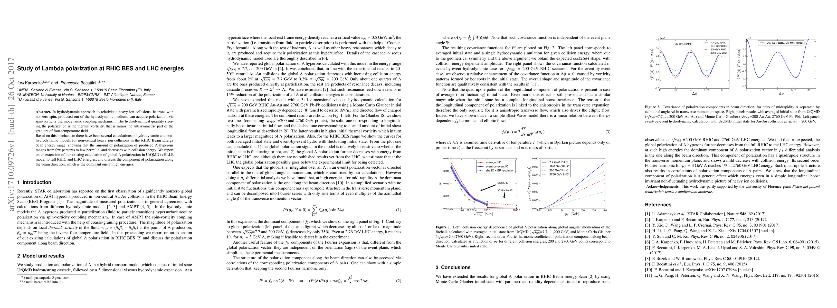 In hydrodynamic approach to relativistic heavy ion collisions, hadrons with nonzero spin, produced out of the hydrodynamic medium, can acquire polarization via spin-vorticity thermodynamic coupling mechanism. The hydrodynamical quantity steering the polarization is the thermal vorticity, that is minus the antisymmetric part of the gradient of four-temperature field. Based on this mechanism there have been several calculations in hydrodynamic and non-hydrodynamic models for non-central heavy ion collisions in the RHIC Beam Energy Scan energy range, showing that the amount of polarization of produced $\Lambda$ hyperons ranges from few percents to few permille, and decreases with collision energy. We report on an extension of our existing calculation of global $\Lambda$ polarization in UrQMD+vHLLE model to full RHIC and LHC energies, and discuss the component of polarization along the beam direction, which is the dominant one at high energies.