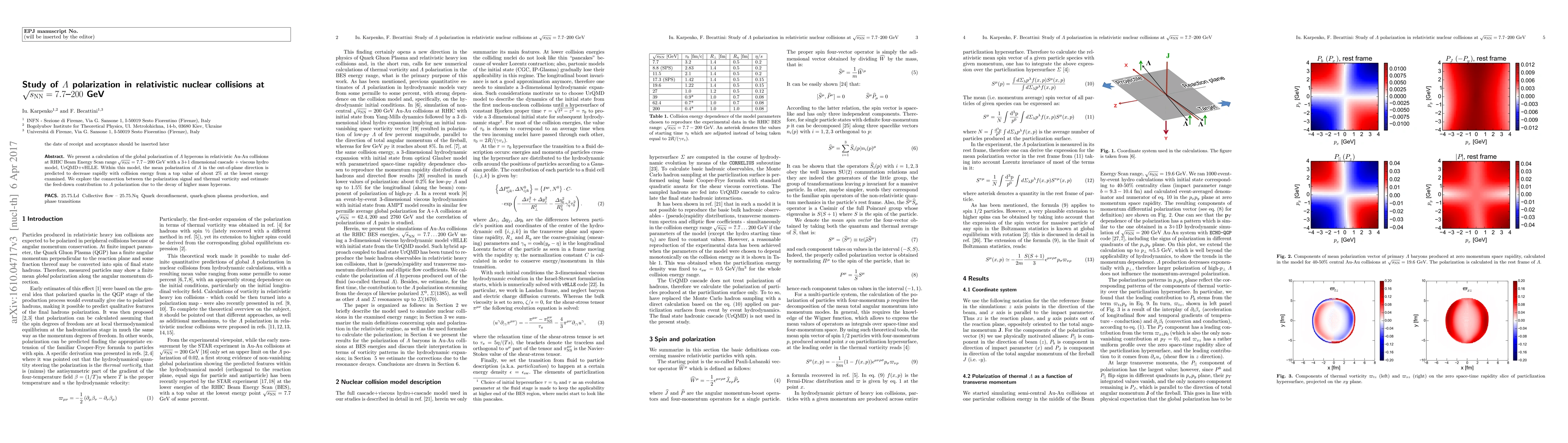 We present a calculation of the global polarization of Lambda hyperons in relativistic Au-Au collisions at RHIC Beam Energy Scan range sqrt{s}_NN = 7.7 - 200 GeV with a 3+1 dimensional cascade + viscous hydro + cascade model, UrQMD+vHLLE. Within this model, the mean polarization of Lambda in the out-of-plane direction is predicted to decrease rapidly with collision energy from a top value of about 2% at the lowest energy examined. We explore the connection between the polarization signal and thermal vorticity and estimate the feed-down contribution to Lambda polarization due to the decay of higher mass hyperons.