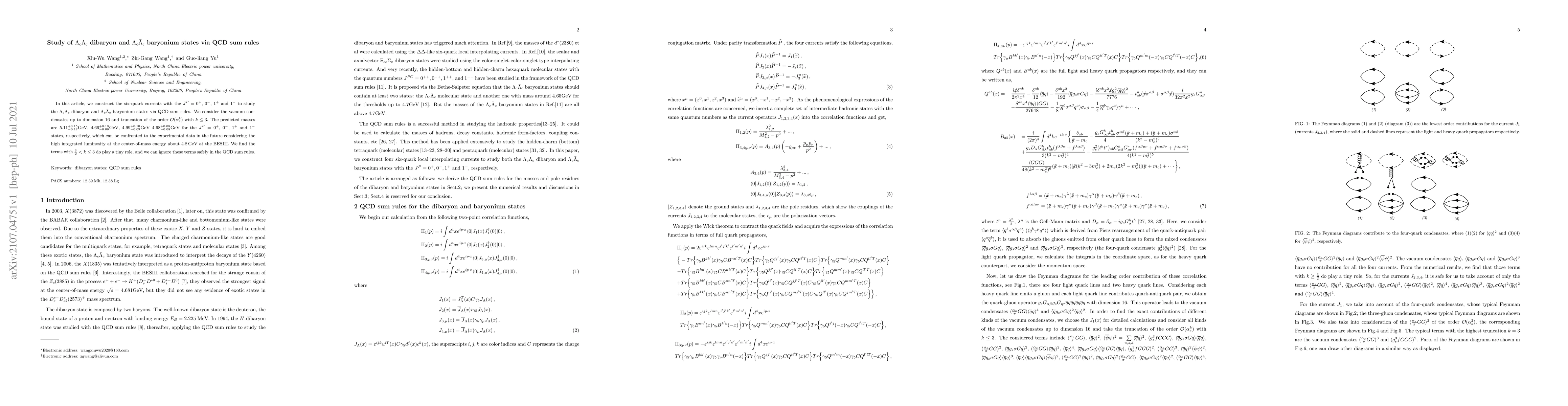 This paper investigates $\Lambda_c$$\Lambda_c$ dibaryon and $\Lambda_c$$\bar{\Lambda}_c$ baryonium states using QCD sum rules, predicting their masses and suggesting that higher-order terms in the sum rules have negligible effects. The predicted masses are $5.11^{+0.15}_{-0.12}$ GeV, $4.66^{+0.10}_{-0.06}$ GeV, $4.99^{+0.10}_{-0.09}$ GeV, and $4.68^{+0.08}_{-0.08}$ GeV for $J^P=0^+$, $0^-$, $1^+$, and $1^-$ states, respectively.