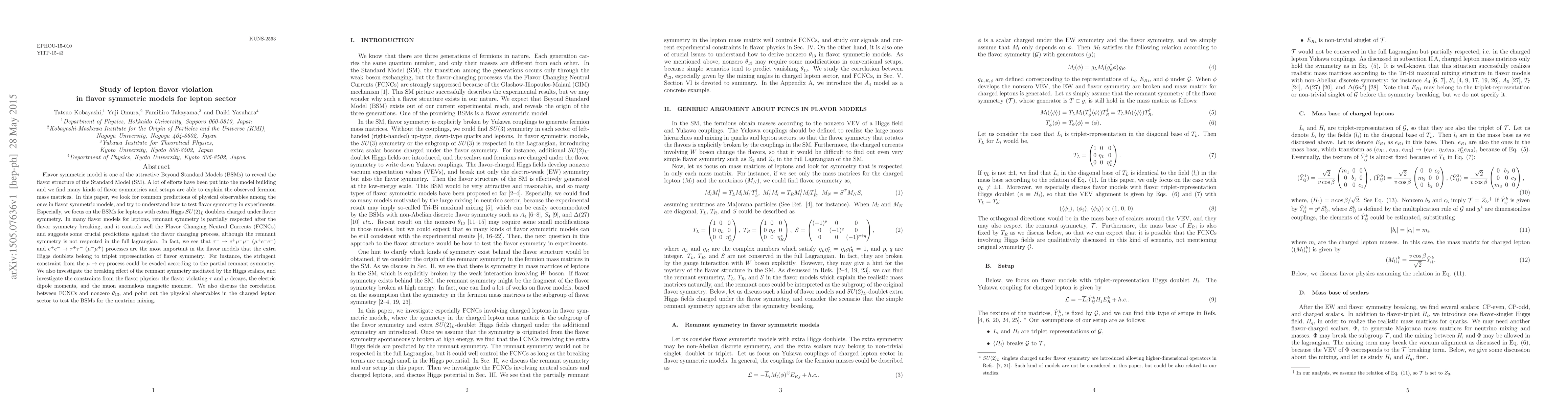 Flavor symmetric model is one of the attractive Beyond Standard Models (BSMs) to reveal the flavor structure of the Standard Model (SM). A lot of efforts have been put into the model building and we find many kinds of flavor symmetries and setups are able to explain the observed fermion mass matrices. In this paper, we look for common predictions of physical observables among the ones in flavor symmetric models, and try to understand how to test flavor symmetry in experiments. Especially, we focus on the BSMs for leptons with extra Higgs $SU(2)_L$ doublets charged under flavor symmetry. In many flavor models for leptons, remnant symmetry is partially respected after the flavor symmetry breaking, and it controls well the Flavor Changing Neutral Currents (FCNCs) and suggests some crucial predictions against the flavor changing process, although the remnant symmetry is not respected in the full lagrangian. In fact, we see that $\tau^- \to e^+ \mu^- \mu^-$ $( \mu^+ e^- e^-)$ and $e^+ e^- \to \tau^+\tau^-$ $(\mu^-\mu^+)$ processes are the most important in the flavor models that the extra Higgs doublets belong to triplet representation of flavor symmetry. For instance, the stringent constraint from the $\mu \to e \gamma$ process could be evaded according to the partial remnant symmetry. We also investigate the breaking effect of the remnant symmetry mediated by the Higgs scalars, and investigate the constraints from the flavor physics: the flavor violating $\tau$ and $\mu$ decays, the electric dipole moments, and the muon anomalous magnetic moment. We also discuss the correlation between FCNCs and nonzero $\theta_{13}$, and point out the physical observables in the charged lepton sector to test the BSMs for the neutrino mixing.