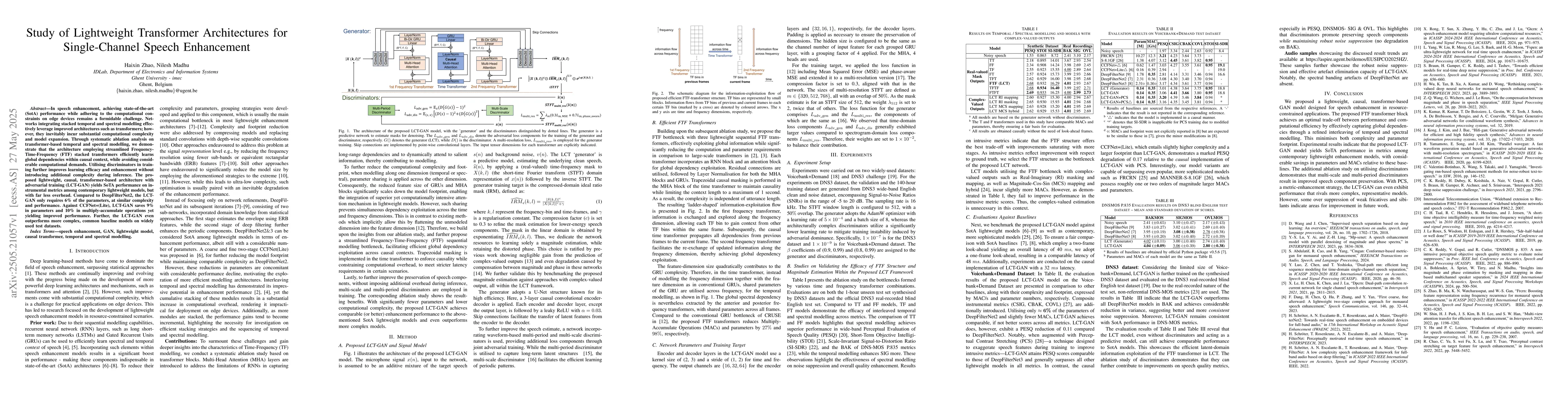 The main technical contribution is the development of a lightweight, causal transformer-based architecture (LCT-GAN) for single-channel speech enhancement, which efficiently models global dependencies while minimizing computational demands.