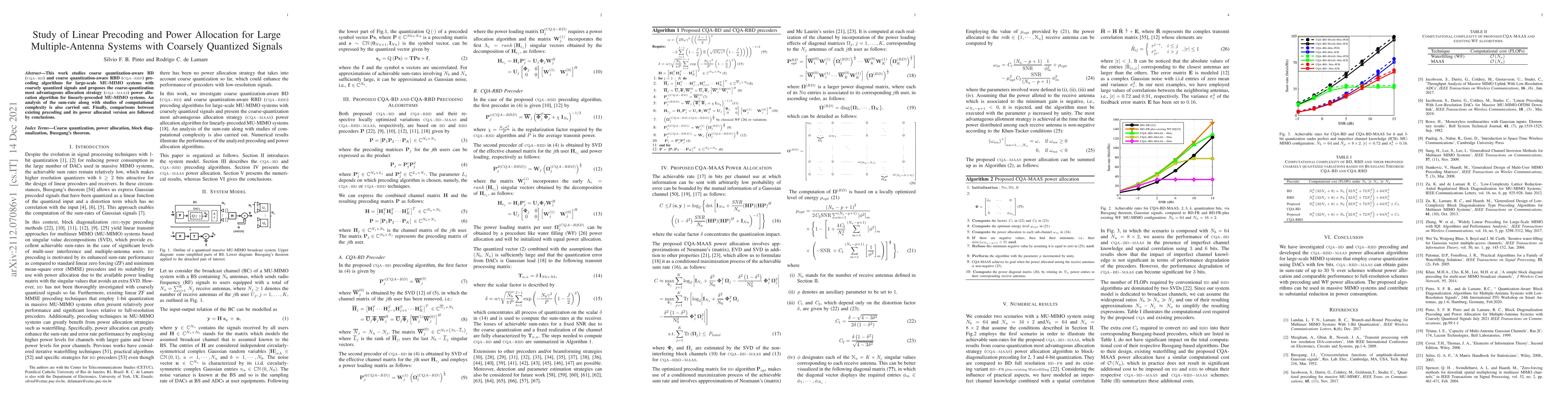 This paper investigates precoding algorithms for large-scale MU-MIMO systems with coarsely quantized signals, proposing CQA-BD and CQA-RBD precoding methods and the CQA-MAAS power allocation strategy. It analyzes the sum-rate and computational complexity, concluding with comparisons to existing methods.