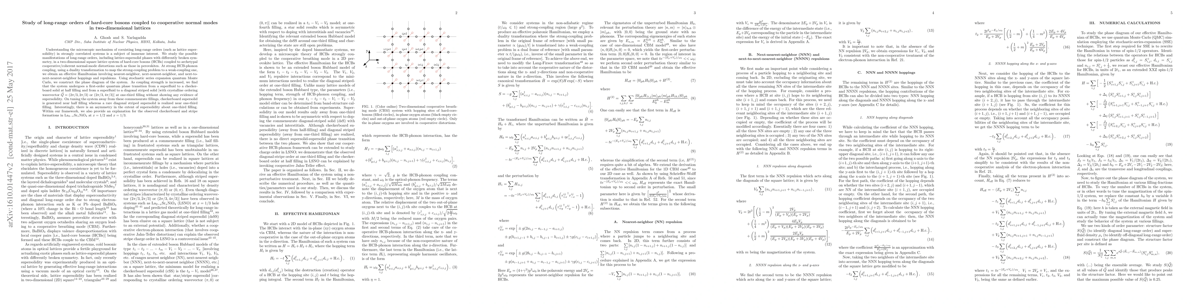Understanding the microscopic mechanism of coexisting long-range orders (such as lattice supersolidity) in strongly correlated systems is a subject of immense interest. We study the possible manifestations of long-range orders, including lattice-supersolid phases with differently broken symmetry, in a two-dimensional square lattice system of hard-core bosons (HCBs) coupled to archetypal cooperative/coherent normal-mode distortions such as those in perovskites. At strong HCB-phonon coupling, using a duality transformation to map the strong-coupling problem to a weak-coupling one, we obtain an effective Hamiltonian involving nearest-neighbor, next-nearest-neighbor, and next-to-next-nearest-neighbor hoppings and repulsions. Using stochastic series expansion quantum Monte Carlo, we construct the phase diagram of the system. As coupling strength is increased, we find that the system undergoes a first-order quantum phase transition from a superfluid to a checkerboard solid at half filling and from a superfluid to a diagonal striped solid [with crystalline ordering wavevector $\vec{Q}=(2\pi/3,2\pi/3)$ or $(2\pi/3,4\pi/3)$] at one-third filling without showing any evidence of supersolidity. On tuning the system away from these commensurate fillings, checkerboard supersolid is generated near half filling whereas a rare diagonal striped supersolid is realized near one-third filling. Interestingly, there is an asymmetry in the extent of supersolidity about one-third filling. Within our framework, we also provide an explanation for the observed checkerboard and stripe formations in ${\rm La}_{2-x}{\rm Sr}_x{\rm NiO_4}$ at $x=1/2$ and $x=1/3$.