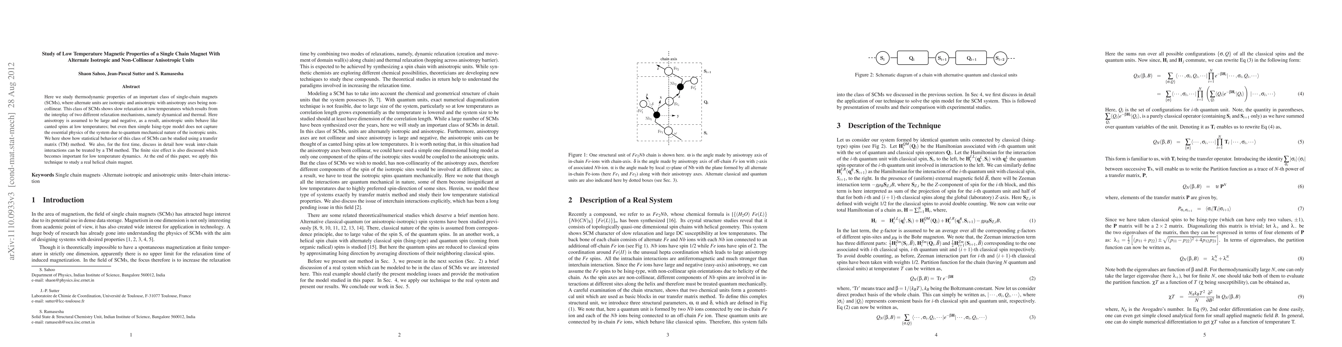 Here we study thermodynamic properties of an important class of single-chain magnets (SCMs), where alternate units are isotropic and anisotropic with anisotropy axes being non-collinear. This class of SCMs shows slow relaxation at low temperatures which results from the interplay of two different relaxation mechanisms, namely dynamical and thermal. Here anisotropy is assumed to be large and negative, as a result, anisotropic units behave like canted spins at low temperatures; but even then simple Ising-type model does not capture the essential physics of the system due to quantum mechanical nature of the isotropic units. We here show how statistical behavior of this class of SCMs can be studied using a transfer matrix (TM) method. We also, for the first time, discuss in detail how weak inter-chain interactions can be treated by a TM method. The finite size effect is also discussed which becomes important for low temperature dynamics. At the end of this paper, we apply this technique to study a real helical chain magnet.