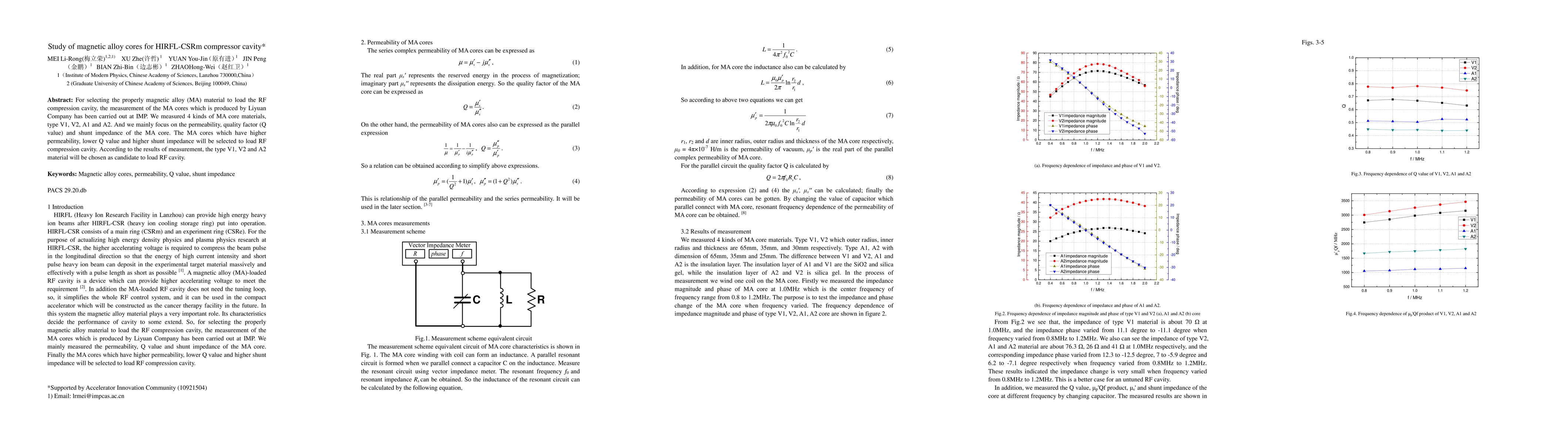 Researchers selected three magnetic alloy materials (V1, V2, A2) for loading an RF compression cavity based on high permeability and shunt impedance, while minimizing quality factor Q value.