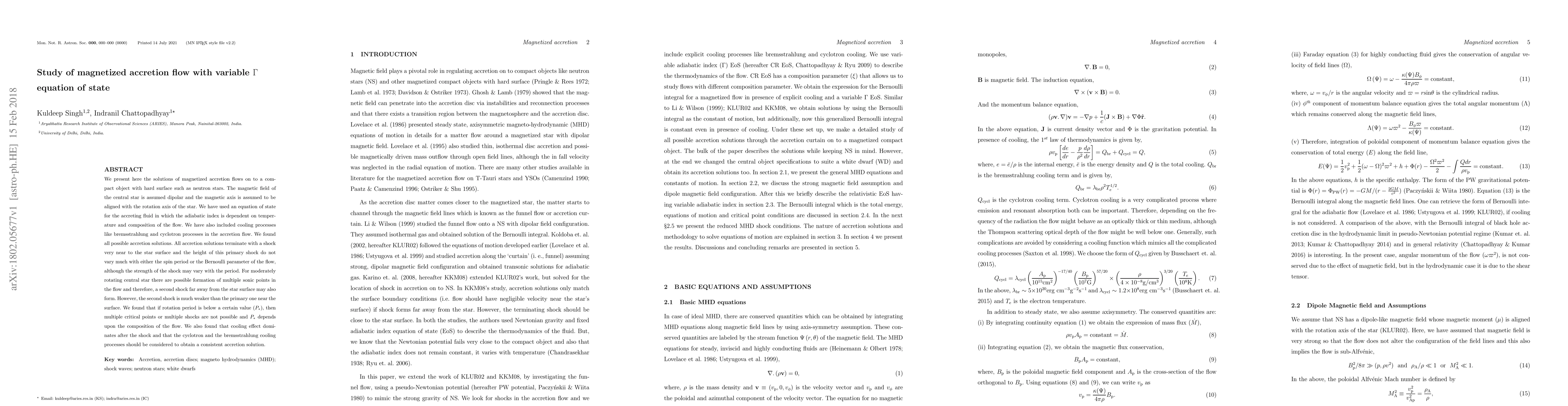 We present here the solutions of magnetized accretion flows on to a compact object with hard surface such as neutron stars. The magnetic field of the central star is assumed dipolar and the magnetic axis is assumed to be aligned with the rotation axis of the star. We have used an equation of state for the accreting fluid in which the adiabatic index is dependent on temperature and composition of the flow. We have also included cooling processes like bremsstrahlung and cyclotron processes in the accretion flow. We found all possible accretion solutions. All accretion solutions terminate with a shock very near to the star surface and the height of this primary shock do not vary much with either the spin period or the Bernoulli parameter of the flow, although the strength of the shock may vary with the period. For moderately rotating central star there are possible formation of multiple sonic points in the flow and therefore, a second shock far away from the star surface may also form. However, the second shock is much weaker than the primary one near the surface. We found that if rotation period is below a certain value $(\pmin)$, then multiple critical points or multiple shocks are not possible and $\pmin$ depends upon the composition of the flow. We also found that cooling effect dominates after the shock and that the cyclotron and the bremsstrahlung cooling processes should be considered to obtain a consistent accretion solution.