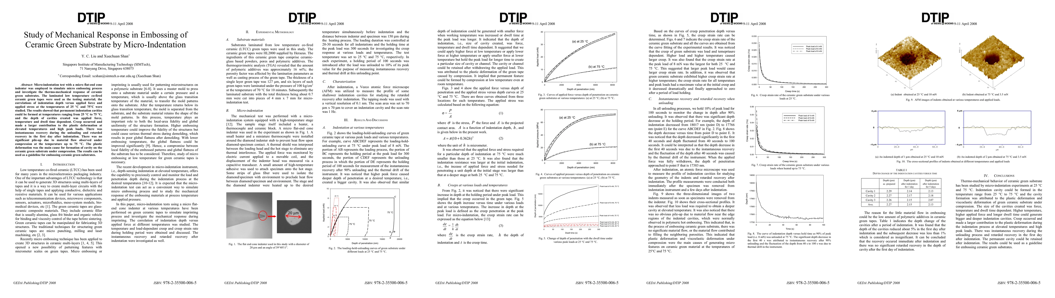 Micro-indentation test with a micro flat-end cone indenter was employed to simulate micro embossing process and investigate the thermo-mechanical response of ceramic green substrates. The laminated low temperature co-fired ceramic green tapes were used as the testing material ; the correlations of indentation depth versus applied force and applied stress at the temperatures of 25 degrees C and 75degrees C were studied. The results showed that permanent indentation cavities could be formed at temperatures ranging from 25 degrees C to 75 degrees C, and the depth of cavities created was applied force, temperature and dwell time dependent. Creep occurred and made a larger contribution to the plastic deformation at elevated temperatures and high peak loads. There was instantaneous recovery during the unloading and retarded recovery in the first day after indentation. There was no significant pile-up due to material flow observed under compression at the temperature up to 75 degrees C. The plastic deformation was the main cause for formation of cavity on the ceramic green substrate under compression. The results can be used as a guideline for embossing ceramic green substrates.