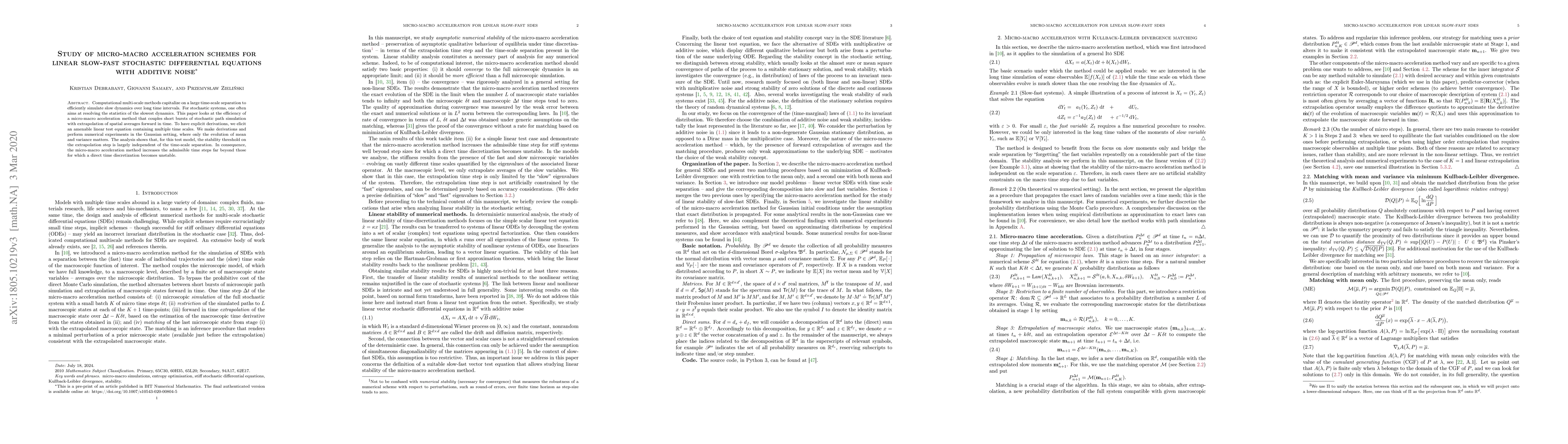 This paper investigates a micro-macro acceleration method for efficiently simulating slow dynamics in stochastic differential equations with additive noise. The method combines short bursts of stochastic path simulation with extrapolation of spatial averages, demonstrating increased stability and larger time step sizes compared to direct time discretization.