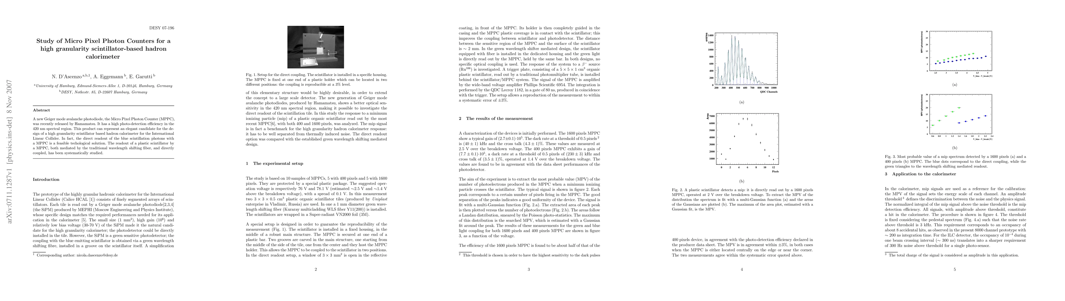 A new Geiger mode avalanche photodiode, the Micro Pixel Photon Counter (MPPC), was recently released by Hamamatsu. It has a high photo-detection efficiency in the 420 nm spectral region. This product can represent an elegant candidate for the design of a high granularity scintillator based hadron calorimeter for the International Linear Collider. In fact, the direct readout of the blue scintillation photons with a MPPC is a feasible techological solution. The readout of a plastic scintillator by a MPPC, both mediated by the traditional wavelength shifting fiber, and directly coupled, has been systematically studied.