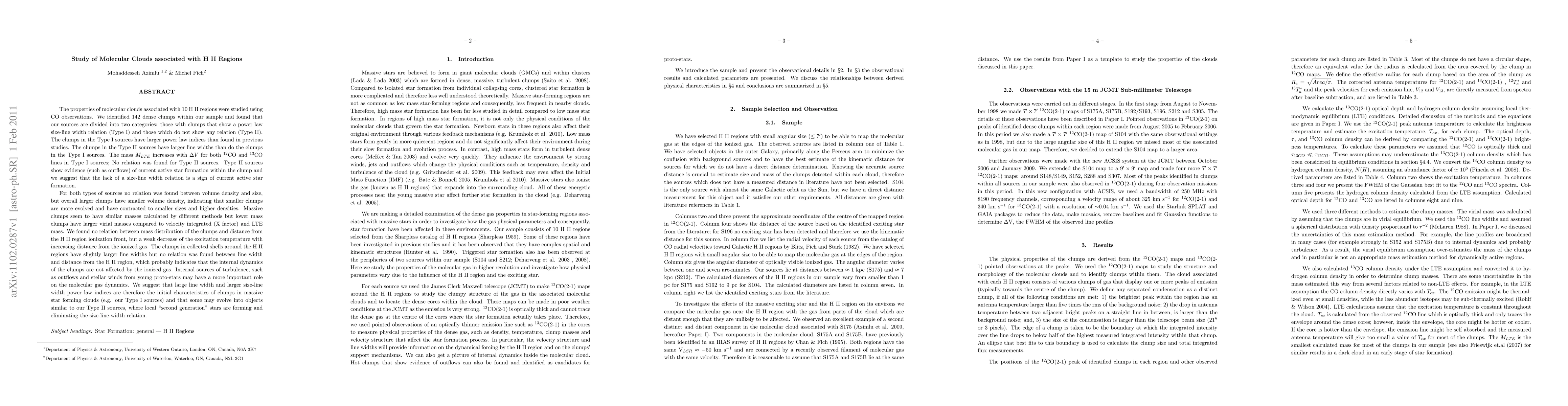 Researchers studied molecular clouds near 10 HII regions using CO observations, finding two types of clumps with distinct size-line width relations and evidence of active star formation in Type II sources.