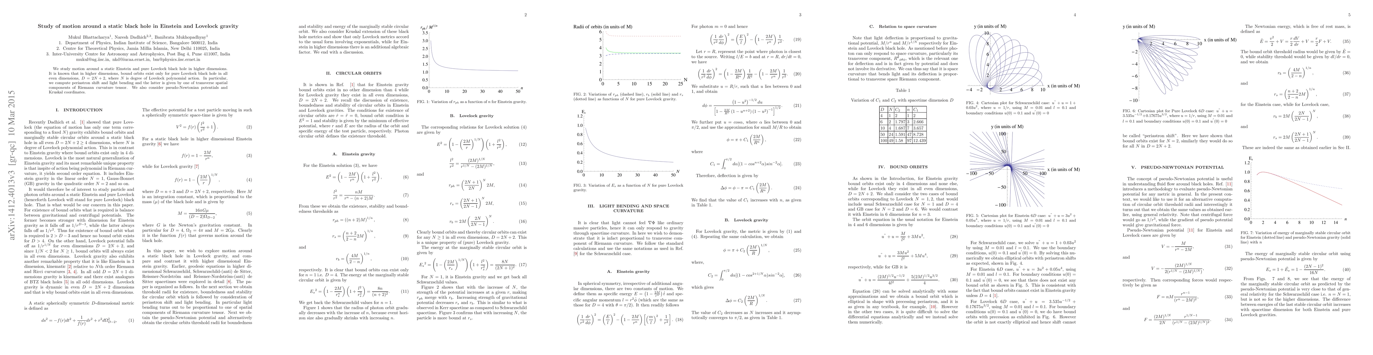 This paper explores the motion around static black holes in Einstein and Lovelock gravity in higher dimensions, focusing on the existence of bound orbits and calculating periastron shift and light bending, with special attention to pseudo-Newtonian potentials and Kruskal coordinates.