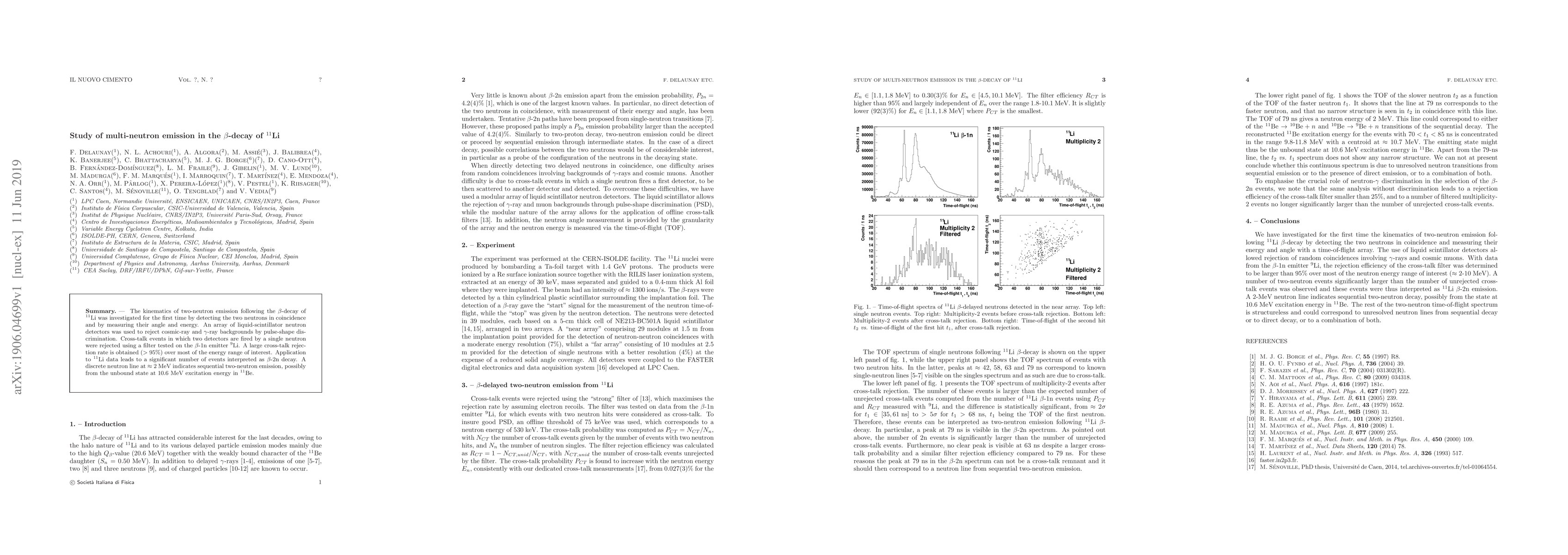 The kinematics of two-neutron emission following the $\beta$-decay of $^{11}$Li was investigated for the first time by detecting the two neutrons in coincidence and by measuring their angle and energy. An array of liquid-scintillator neutron detectors was used to reject cosmic-ray and $\gamma$-ray backgrounds by pulse-shape discrimination. Cross-talk events in which two detectors are fired by a single neutron were rejected using a filter tested on the $\beta$-1n emitter $^9$Li. A large cross-talk rejection rate is obtained ($> 95 \%$) over most of the energy range of interest. Application to $^{11}$Li data leads to a significant number of events interpreted as $\beta$-2n decay. A discrete neutron line at $\approx$ 2 MeV indicates sequential two-neutron emission, possibly from the unbound state at 10.6 MeV excitation energy in $^{11}$Be.