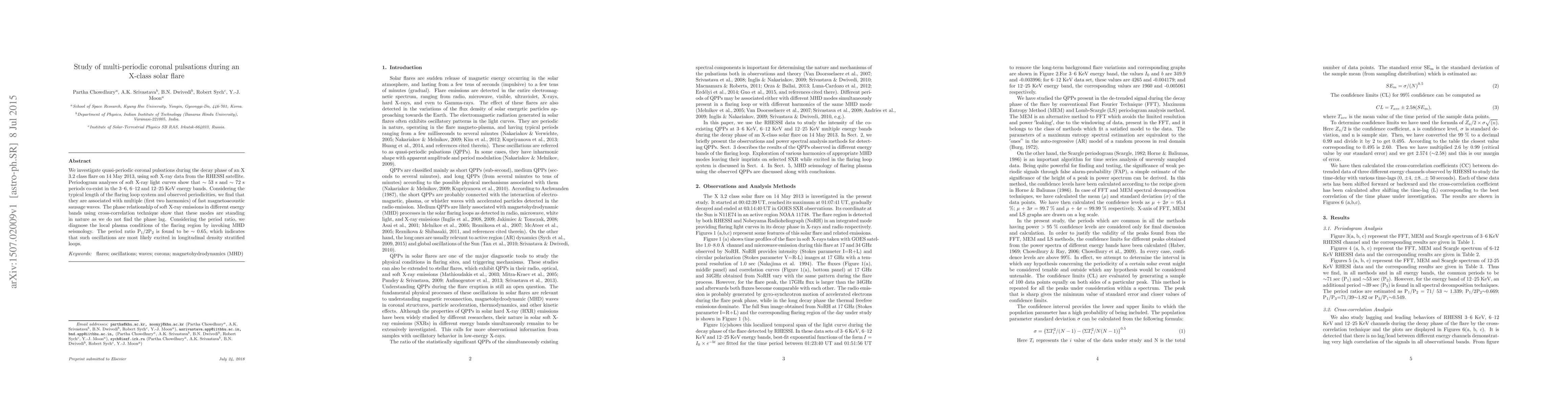 We investigate quasi-periodic coronal pulsations during the decay phase of an X 3.2 class flare on 14 May 2013, using soft X-ray data from the RHESSI satellite. Periodogram analyses of soft X-ray light curves show that 53 s and 72 s periods co-exist in the 3-6, 6-12 and 12-25 KeV energy bands. Considering the typical length of the flaring loop system and observed periodicities, we find that they are associated with multiple (first two harmonics) of fast magnetoacoustic sausage waves. The phase relationship of soft X-ray emissions in different energy bands using cross-correlation technique show that these modes are standing in nature as we do not find the phase lag. Considering the period ratio, we diagnose the local plasma conditions of the flaring region by invoking MHD seismology. The period ratio P1/2P2 is found to be 0.65, which indicates that such oscillations are most likely excited in longitudinal density stratified loops.