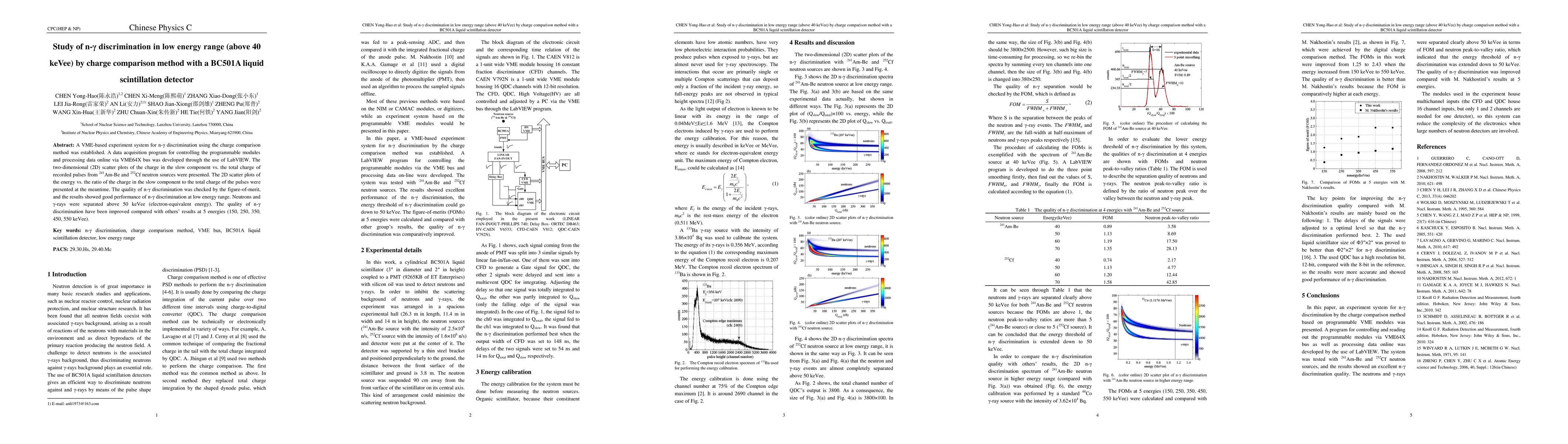 A VME-based experiment system for n-{\gamma} discrimination using the charge comparison method was established. A data acquisition program for controlling the programmable modules and processing data online via VME64X bus was developed through the use of LabVIEW. The two-dimensional (2D) scatter plots of the charge in the slow component vs. the total charge of recorded pulses from Am-Be and Cf neutron sources were presented. The 2D scatter plots of the energy vs. the ratio of the charge in the slow component to the total charge of the pulses were presented at the meantime. The quality of n-{\gamma} discrimination was checked by the figure-of-merit, and the results showed good performance of n-{\gamma} discrimination at low energy range. Neutrons and {\gamma}-rays were separated above 50 keVee (electron-equivalent energy). The quality of n-{\gamma} discrimination have been improved compared with others' results at 5 energies (150, 250, 350, 450, 550 keVee).