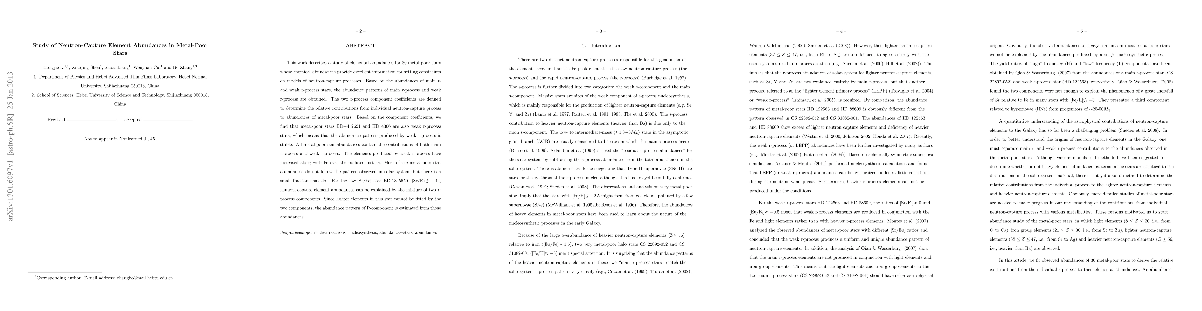 This study investigates neutron-capture element abundances in 30 metal-poor stars, revealing that most exhibit contributions from both main and weak r-processes. Notably, BD+4 2621 and HD 4306 are identified as weak r-process stars, indicating a stable abundance pattern from this process.