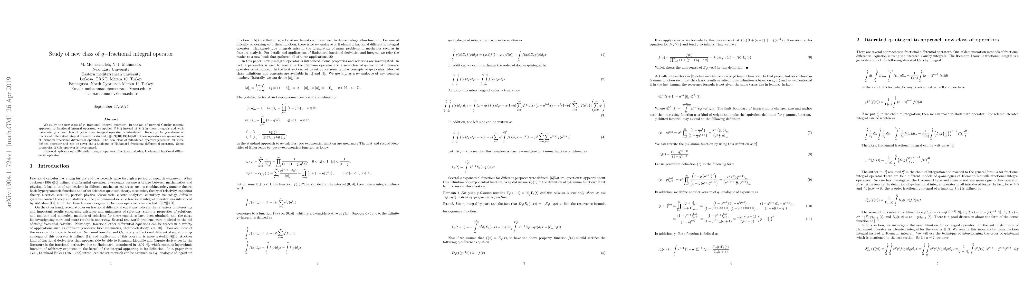 We study the new class of q-fractional integral operator. In the aid of iterated Cauchy integral approach to fractional integral operator, we applied t^pf(t) instead of f(t) in these integrals and with parameter p a new class of q-fractional integral operator is introduced. Recently the q-analogue of fractional differential integral operator is studied.[8][4][9][10][13][14]All of these operators are q-analogue of Riemann fractional differential operator. The new class of introduced operator generalize all these defined operator and can be cover the q-analogue of Hadamard fractional differential operator. Some properties of this operator is investigated.