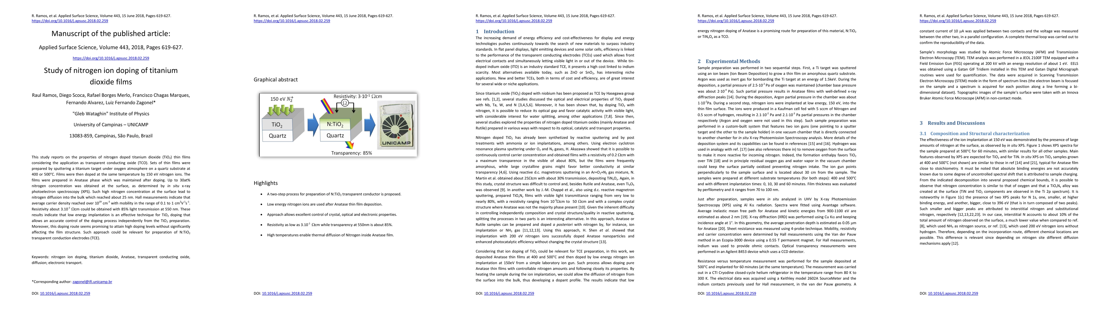 This study investigates nitrogen ion doping of titanium dioxide ($TiO_2$) thin films prepared via sputtering, finding that low-energy implantation effectively controls doping levels up to 30at% nitrogen, maintaining film structure and achieving high carrier density and low resistivity while maintaining transparency.