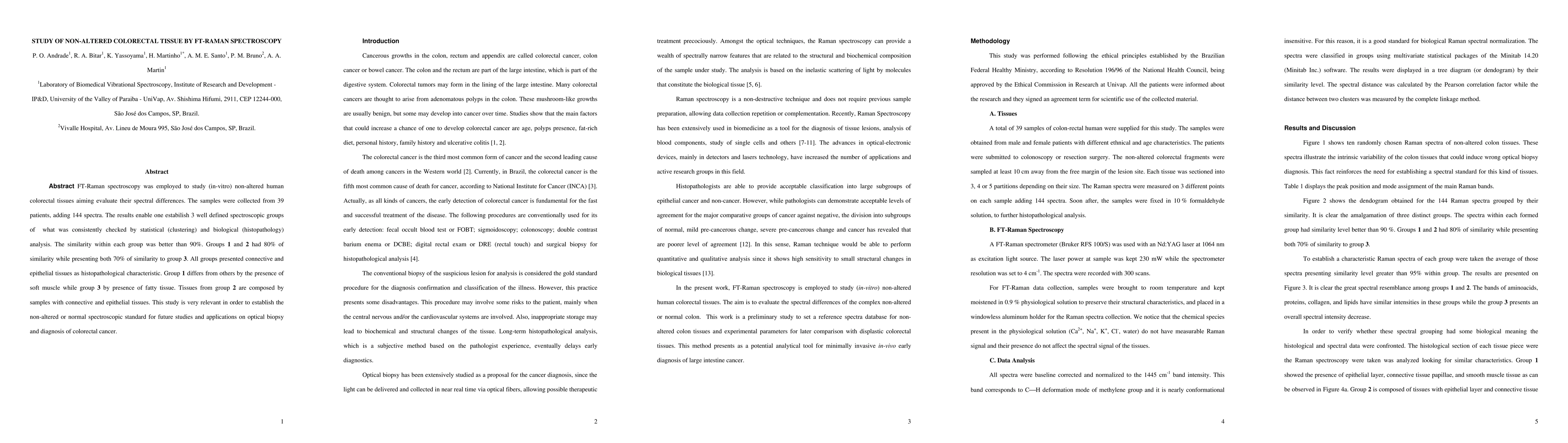 FT-Raman spectroscopy was employed to study (in-vitro) non-altered human colorectal tissues aiming evaluate their spectral differences. The samples were collected from 39 patients, adding 144 spectra. The results enable one estabilish 3 well defined spectroscopic groups of what was consistently checked by statistical (clustering) and biological (histopathology) analysis. The similarity within each group was better than 90%. Groups 1 and 2 had 80% of similarity while presenting both 70% of similarity to group 3. All groups presented connective and epithelial tissues as histopathological characteristic. Group 1 differs from others by the presence of soft muscle while group 3 by presence of fatty tissue. Tissues from group 2 are composed by samples with connective and epithelial tissues. This study is very relevant in order to establish the non-altered or normal spectroscopic standard for future studies and applications on optical biopsy and diagnosis of colorectal cancer.